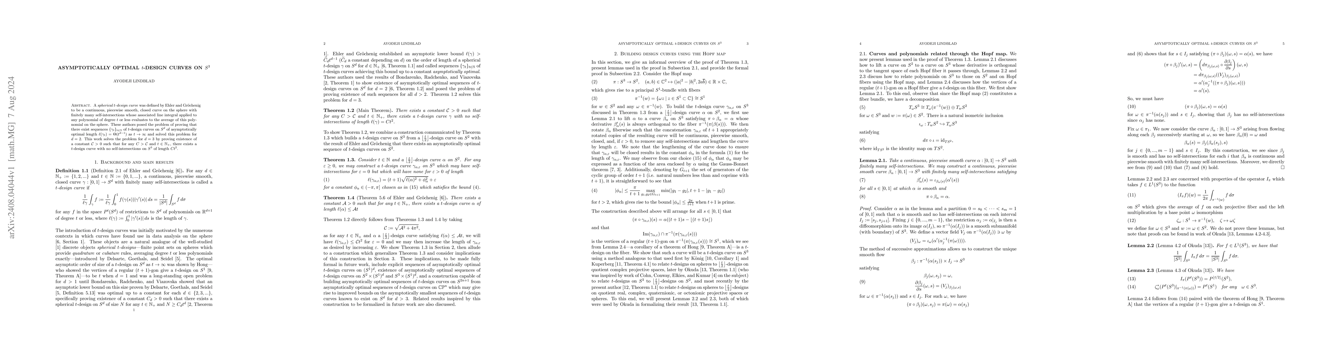 A $\textit{spherical $t$-design curve}$ was defined by Ehler and Gr\"{o}chenig to be a continuous, piecewise smooth, closed curve on the sphere with finitely many self-intersections whose associated line integral applied to any polynomial of degree $t$ or less evaluates to the average of this polynomial on the sphere. These authors posed the problem of proving that there exist sequences $\{\gamma_t\}_{t\in\Bbb N}$ of $t$-design curves on $S^d$ of asymptotically optimal length $\ell(\gamma_t)=\Theta(t^{d-1})$ as $t\to\infty$ and solved this problem for $d=2$. This work solves the problem for $d=3$ by proving existence of a constant $\mathcal C>0$ such that for any $C>\mathcal C$ and $t\in\Bbb N_+$, there exists a $t$-design curve with no self-intersections on $S^3$ of length $Ct^2$.