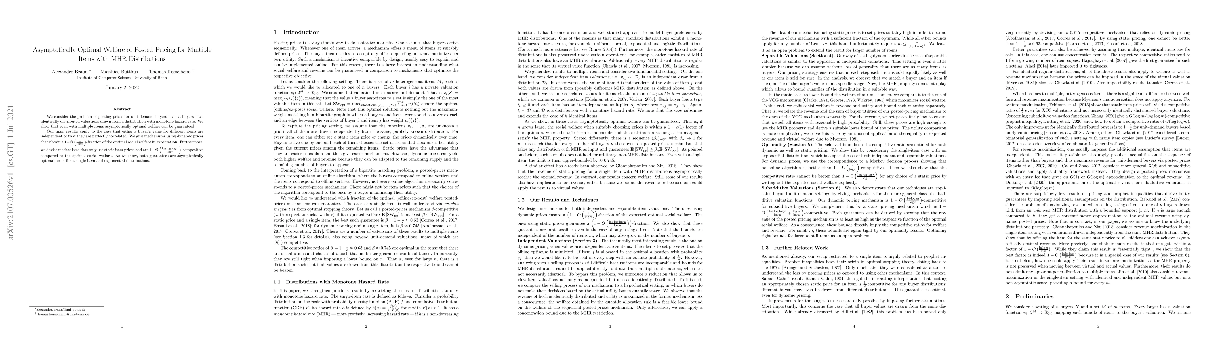 Asymptotically optimal welfare can be guaranteed for multiple items with posted pricing when buyers have identically distributed valuations, even with correlated values. Mechanisms using dynamic or static item prices achieve nearly-optimal social welfare guarantees.
