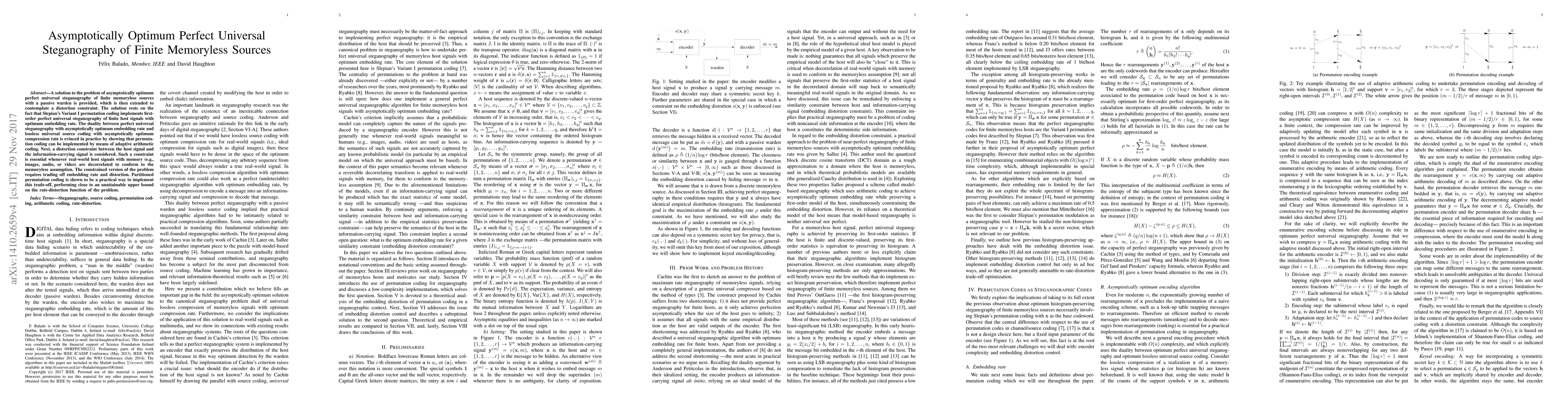 A solution to the problem of asymptotically optimum perfect universal steganography of finite memoryless sources with a passive warden is provided, which is then extended to contemplate a distortion constraint. The solution rests on the fact that Slepian's Variant I permutation coding implements first-order perfect universal steganography of finite host signals with optimum embedding rate. The duality between perfect universal steganography with asymptotically optimum embedding rate and lossless universal source coding with asymptotically optimum compression rate is evinced in practice by showing that permutation coding can be implemented by means of adaptive arithmetic coding. Next, a distortion constraint between the host signal and the information-carrying signal is considered. Such a constraint is essential whenever real-world host signals with memory (e.g., images, audio, or video) are decorrelated to conform to the memoryless assumption. The constrained version of the problem requires trading off embedding rate and distortion. Partitioned permutation coding is shown to be a practical way to implement this trade-off, performing close to an unattainable upper bound on the rate-distortion function of the problem.