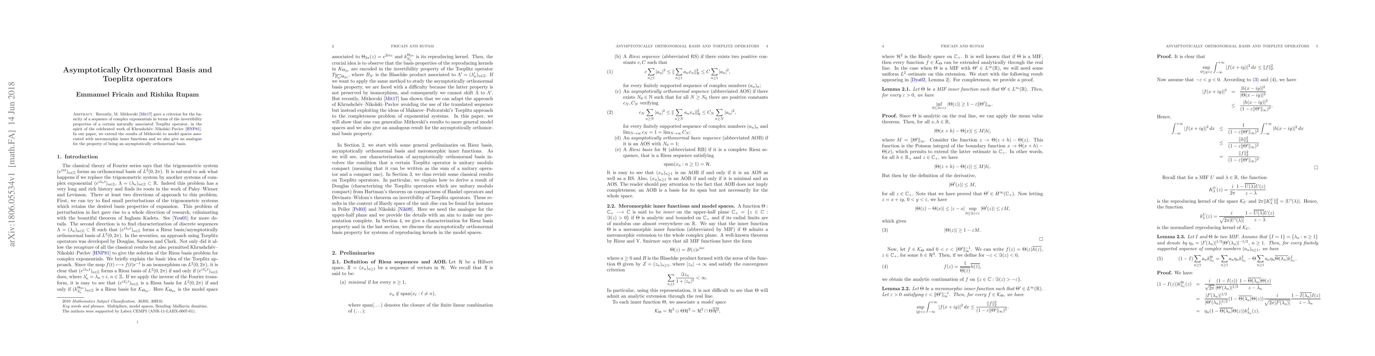 This paper extends Mitkovski's criterion for the basicity of complex exponentials to model spaces linked with meromorphic inner functions, and introduces an analogous concept for asymptotically orthonormal bases in the context of Toeplitz operators.