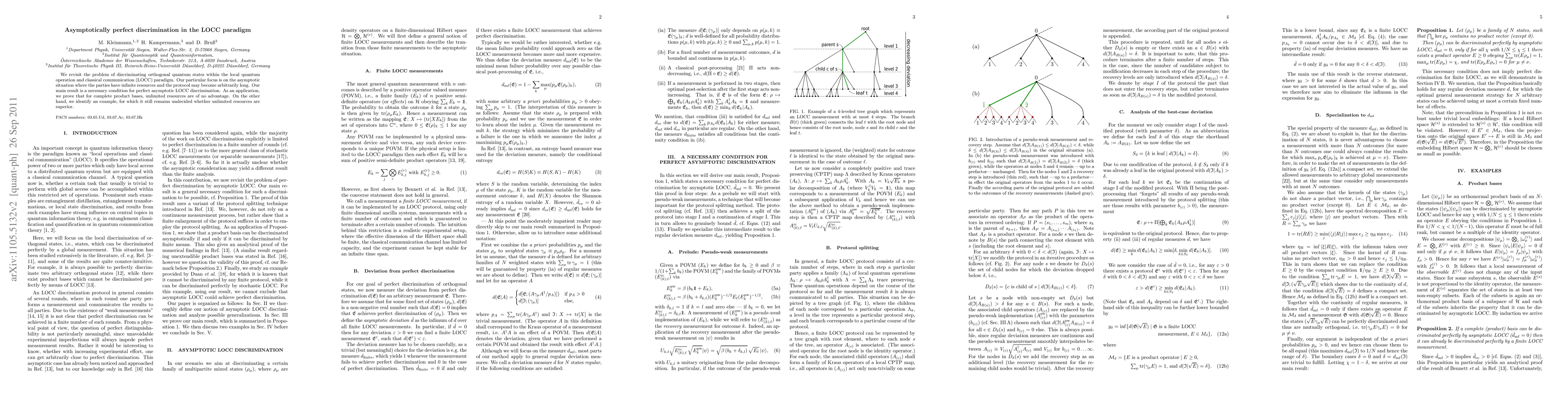 This paper explores asymptotically perfect discrimination of orthogonal quantum states under the LOCC paradigm, revealing a necessary condition for perfect discrimination. It concludes that unlimited resources do not improve discrimination for complete product bases, but leaves open the question for other cases.