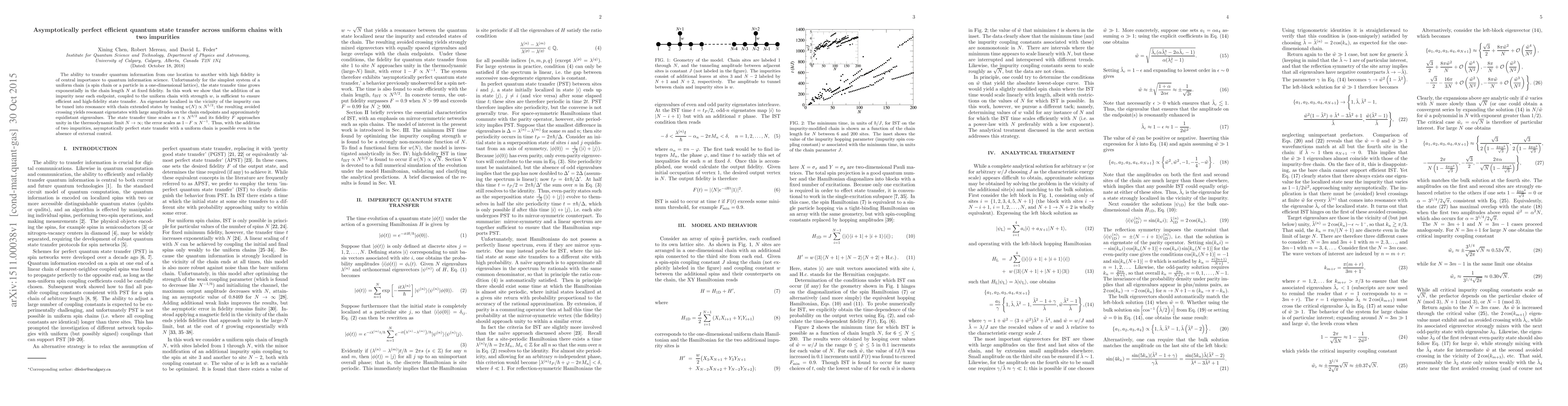 The ability to transfer quantum information from one location to another with high fidelity is of central importance to quantum information science. Unfortunately for the simplest system of a uniform chain (a spin chain or a particle in a one-dimensional lattice), the state transfer time grows exponentially in the chain length $N$ at fixed fidelity. In this work we show that the addition of an impurity near each endpoint, coupled to the uniform chain with strength $w$, is sufficient to ensure efficient and high-fidelity state transfer. An eigenstate localized in the vicinity of the impurity can be tuned into resonance with chain extended states by tuning $w(N)\propto N^{1/2}$; the resulting avoided crossing yields resonant eigenstates with large amplitudes on the chain endpoints and approximately equidistant eigenvalues. The state transfer time scales as $t\propto N^{3/2}$ and its fidelity $F$ approaches unity in the thermodynamic limit $N\to\infty$; the error scales as $1-F\propto N^{-1}$. Thus, with the addition of two impurities, asymptotically perfect state transfer with a uniform chain is possible even in the absence of external control.