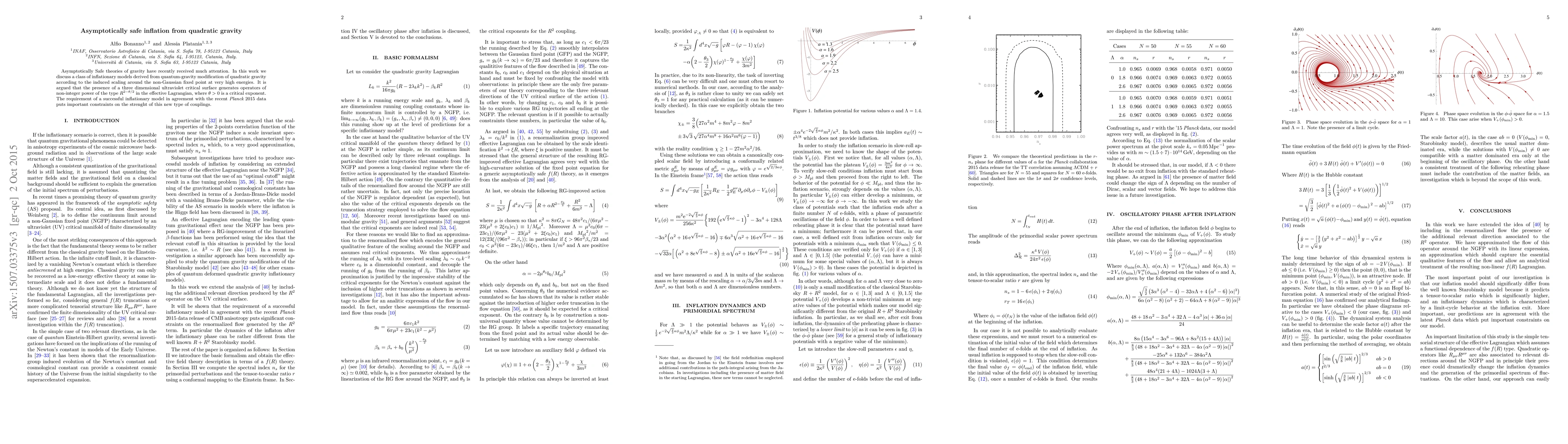 This paper explores inflationary models based on asymptotically safe quantum gravity modifications of quadratic gravity, focusing on the induced scaling near a non-Gaussian fixed point. It highlights the generation of non-integer power operators in the effective Lagrangian and discusses constraints on these new couplings from the Planck 2015 data for successful inflation.