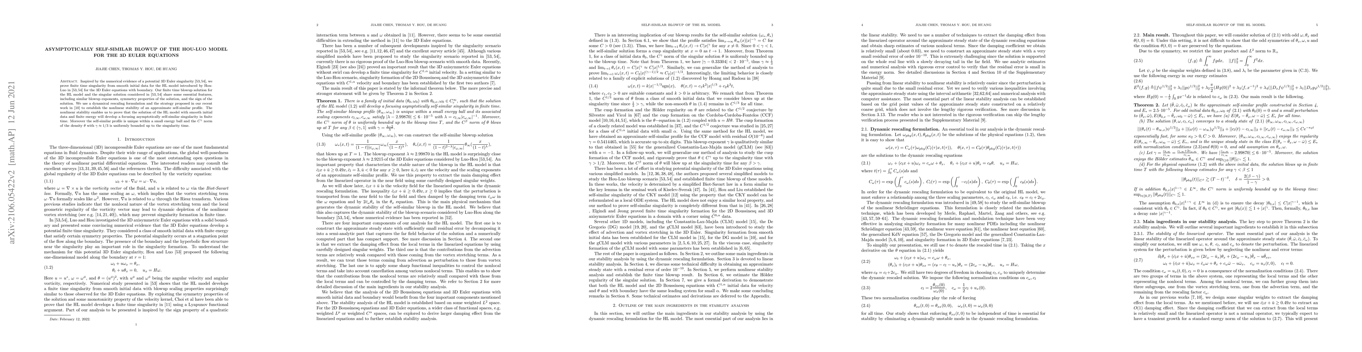 This paper proves finite time singularity for the Hou-Luo model of the 3D Euler equations, establishing asymptotic self-similarity of the blowup solution. The study utilizes a dynamical rescaling and nonlinear stability to demonstrate the unique self-similar profile and boundedness of the density's $C^\gamma$ norm up to the singularity.