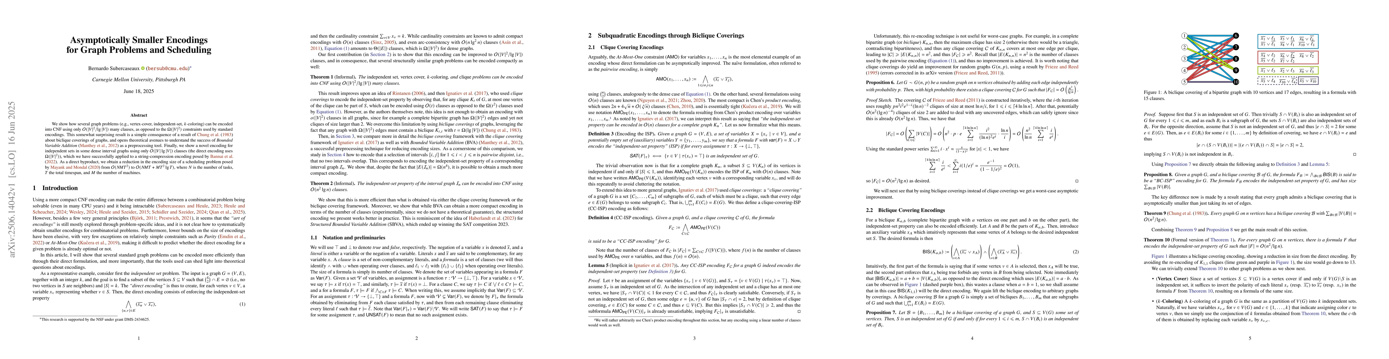 We show how several graph problems (e.g., vertex-cover, independent-set, $k$-coloring) can be encoded into CNF using only $O(|V|^2 / \lg |V|)$ many clauses, as opposed to the $\Omega(|V|^2)$ constraints used by standard encodings. This somewhat surprising result is a simple consequence of a result of Erd\H{o}s, Chung, and Spencer (1983) about biclique coverings of graphs, and opens theoretical avenues to understand the success of "Bounded Variable Addition'' (Manthey, Heule, and Biere, 2012) as a preprocessing tool. Finally, we show a novel encoding for independent sets in some dense interval graphs using only $O(|V| \lg |V|)$ clauses (the direct encoding uses $\Omega(|V|^2)$), which we have successfully applied to a string-compression encoding posed by Bannai et al. (2022). As a direct byproduct, we obtain a reduction in the encoding size of a scheduling problem posed by Mayank and Modal (2020) from $O(NMT^2)$ to $O(NMT + M T^2 \lg T)$, where $N$ is the number of tasks, $T$ the total timespan, and $M$ the number of machines.