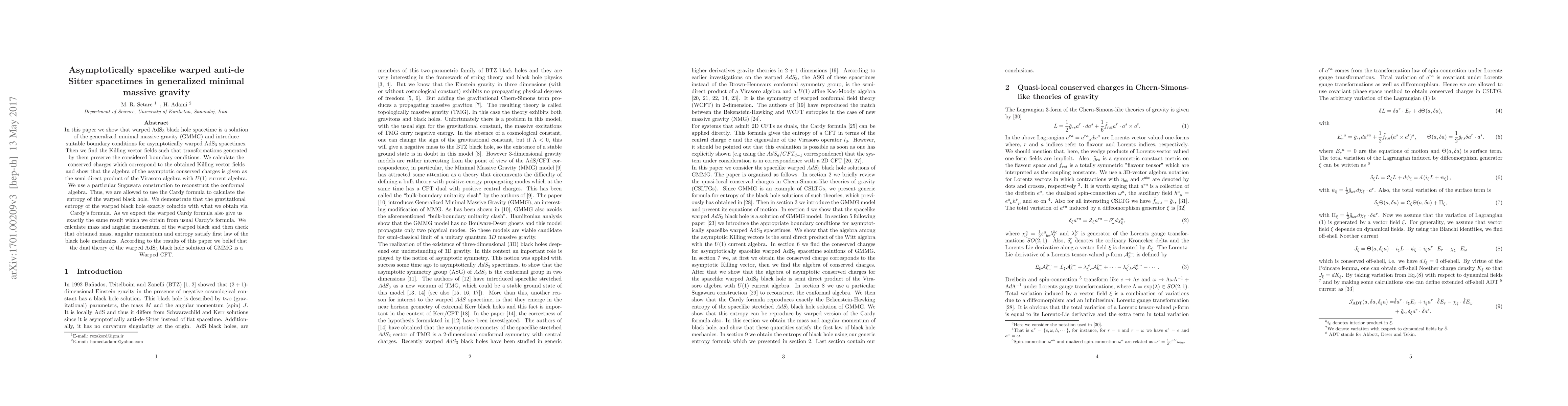 In this paper we show that warped AdS$_{3}$ black hole spacetime is a solution of the generalized minimal massive gravity (GMMG) and introduce suitable boundary conditions for asymptotically warped AdS$_{3}$ spacetimes. Then we find the Killing vector fields such that transformations generated by them preserve the considered boundary conditions. We calculate the conserved charges which correspond to the obtained Killing vector fields and show that the algebra of the asymptotic conserved charges is given as the semi direct product of the Virasoro algebra with $U(1)$ current algebra. We use a particular Sugawara construction to reconstruct the conformal algebra. Thus, we are allowed to use the Cardy formula to calculate the entropy of the warped black hole. We demonstrate that the gravitational entropy of the warped black hole exactly coincide with what we obtain via Cardy's formula. As we expect the warped Cardy formula also give us exactly the same result which we obtain from usual Cardy's formula. We calculate mass and angular momentum of the warped black and then check that obtained mass, angular momentum and entropy satisfy first law of the black hole mechanics. According to the results of this paper we belief that the dual theory of the warped AdS$_{3}$ black hole solution of GMMG is a Warped CFT.