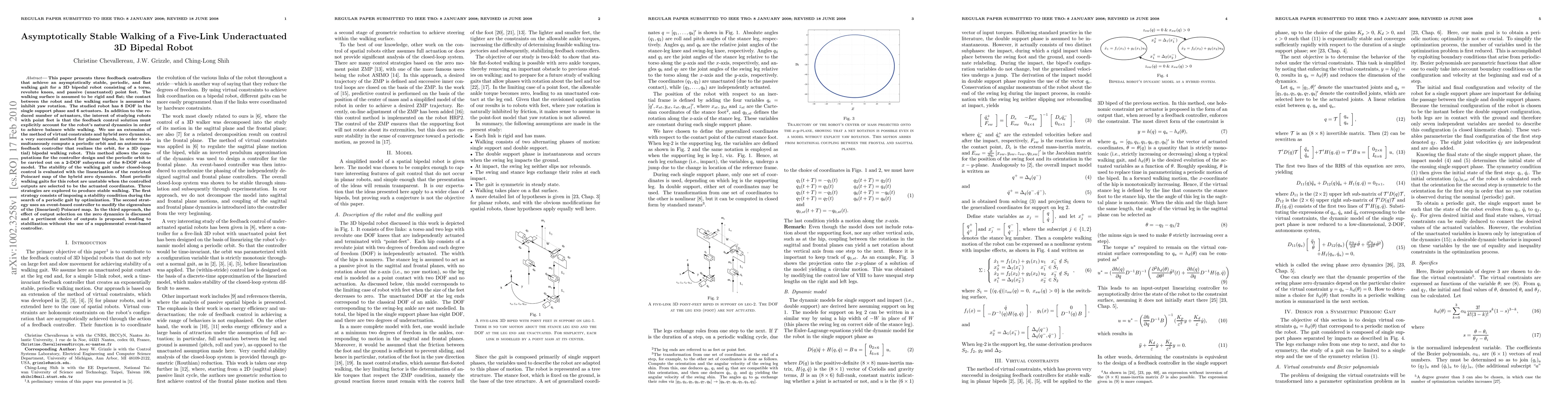 This paper develops three feedback controllers for a five-link, underactuated 3D bipedal robot to achieve stable, fast walking gaits. It employs an extended method of virtual constraints and hybrid zero dynamics to compute a periodic orbit and autonomous feedback controller, ensuring stability through linearization of the restricted Poincaré map.