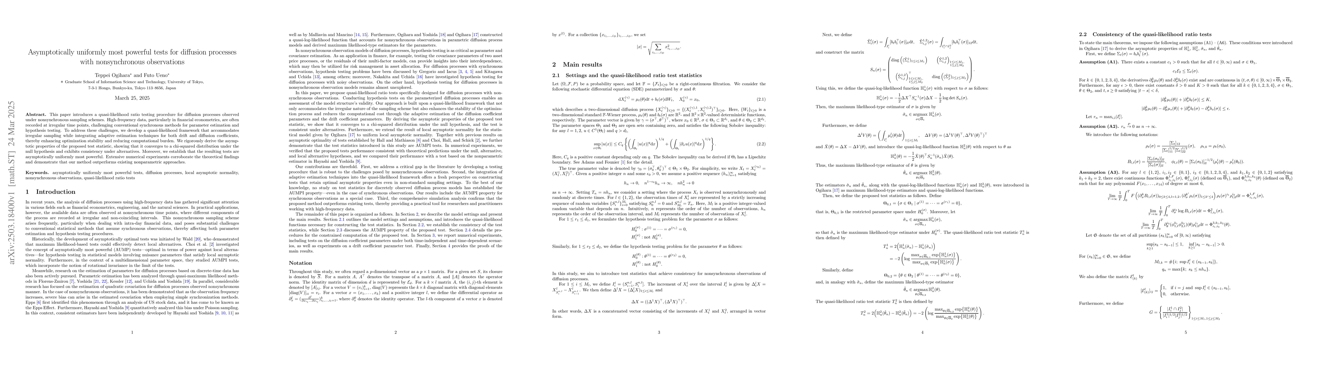 The paper presents a quasi-likelihood testing procedure with asymptotic properties for diffusion processes under nonsynchronous observations, enhancing optimization stability and reducing computational burden.