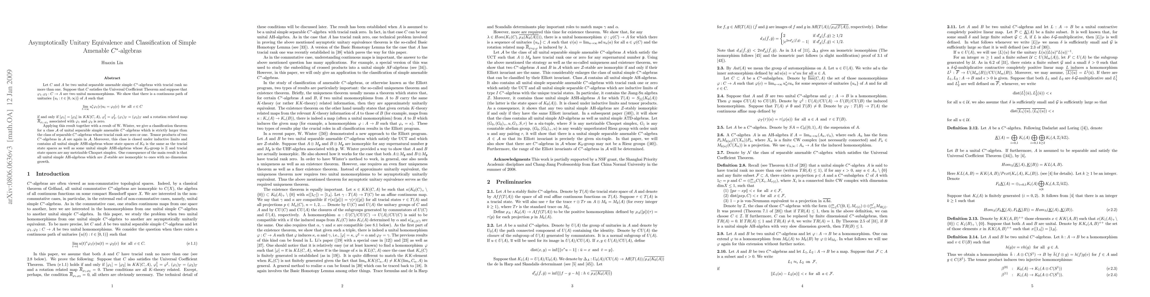 Let $C$ and $A$ be two unital separable amenable simple C*-algebras with tracial rank no more than one. Suppose that $C$ satisfies the Universal Coefficient Theorem and suppose that $\phi_1, \phi_2: C\to A$ are two unital monomorphisms. We show that there is a continuous path of unitaries $\{u_t: t\in [0, \infty)\}$ of $A$ such that $$ \lim_{t\to\infty}u_t^*\phi_1(c)u_t=\phi_2(c)\tforal c\in C $$ if and only if $[\phi_1]=[\phi_2]$ in $KK(C,A),$ $\phi_1^{\ddag}=\phi_2^{\ddag},$ $(\phi_1)_T=(\phi_2)_T$ and a rotation related map $\bar{R}_{\phi_1,\phi_2}$ associated with $\phi_1$ and $\phi_2$ is zero. Applying this result together with a result of W. Winter, we give a classification theorem for a class ${\cal A}$ of unital separable simple amenable \CA s which is strictly larger than the class of separable \CA s whose tracial rank are zero or one. The class contains all unital simple ASH-algebras whose state spaces of $K_0$ are the same as the tracial state spaces as well as the simple inductive limits of dimension drop circle algebras. Moreover it contains some unital simple ASH-algebras whose $K_0$-groups are not Riesz. One consequence of the main result is that all unital simple AH-algebras which are ${\cal Z}$-stable are isomorphic to ones with no dimension growth.