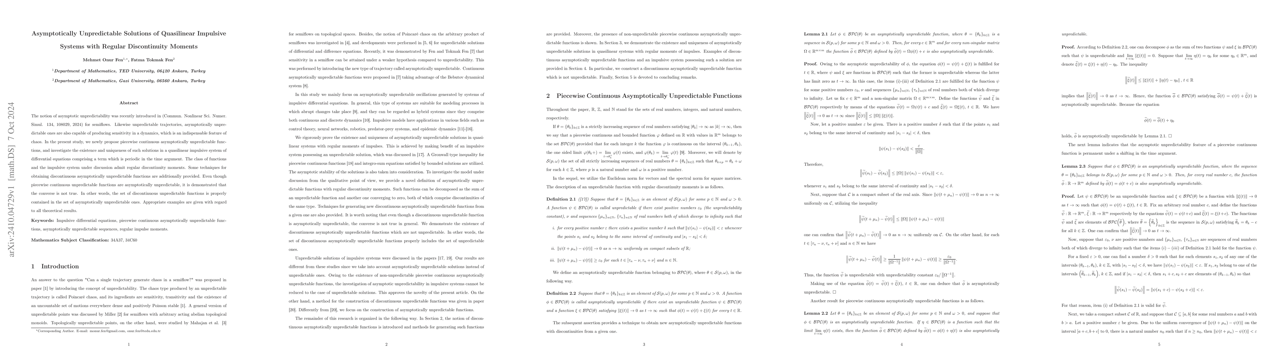 The notion of asymptotic unpredictability was recently introduced in (Commun. Nonlinear Sci. Numer. Simul. 134, 108029, 2024) for semiflows. Likewise unpredictable trajectories, asymptotically unpredictable ones are also capable of producing sensitivity in a dynamics, which is an indispensable feature of chaos. In the present study, we newly propose piecewise continuous asymptotically unpredictable functions, and investigate the existence and uniqueness of such solutions in a quasilinear impulsive system of differential equations comprising a term which is periodic in the time argument. The class of functions and the impulsive system under discussion admit regular discontinuity moments. Some techniques for obtaining discontinuous asymptotically unpredictable functions are additionally provided. Even though piecewise continuous unpredictable functions are asymptotically unpredictable, it is demonstrated that the converse is not true. In other words, the set of discontinuous unpredictable functions is properly contained in the set of asymptotically unpredictable ones. Appropriate examples are given with regard to all theoretical results.