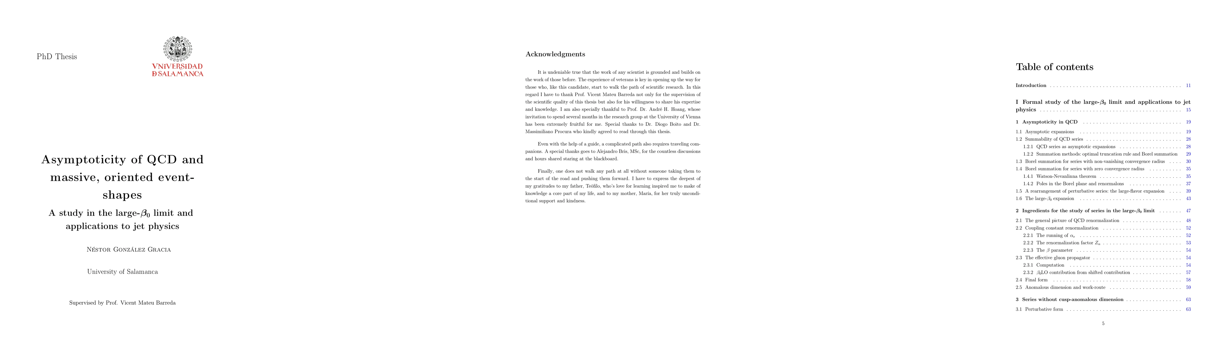 This is a doctoral thesis dissertation developed in the frame of theoretical QCD predictions, with focus on two main topics. On the one hand, the large-order bahavior of perturbative QCD series is discussed. By reviewing the main literature, a cohesive discussion is made that includes the topics of large-order divergencies in QCD, renormalons, summation methods for asymptotic series and non-perturbative power corrections. A formalism for perturbative QCD series in the large-$\beta_0$ is presented, which allows for (1) the computation of the series, its renormalization factor and anomalous dimension, (2) the sum of all these quantities, (3) the study of the renormalon structure of the series and (4), the ambiguity in the sum due to IR renormalons, which is associated with the size of non-power corrections. Original and published work has been made to develop this formalism for both series without and with cusp-anomalous dimension. A large number of applications of our formalism are also presented, covering the short-distance mass schemes $\bar{\rm MS}$ and MSR, the QCD-to-SCET and SCET-to-bHQET matching coeficients and the SCET and bHQET jet functions. On the other hand, original and also published work in fixed-order perturbation theory is also carried out in the field of event shapes. The event-shape distribution for $e^+e^-$ to hadrons is computed to NLO differential with respect to the angle between the initial beam and the thrust axis of the event. The relevant finding is the presence of the quark mass already at $\cal{O}(\alpha_s^0)$ for the vector current. Finally, the dissertation also contains a brief study on the FOPT-CIPT difference in the context of tau decays.