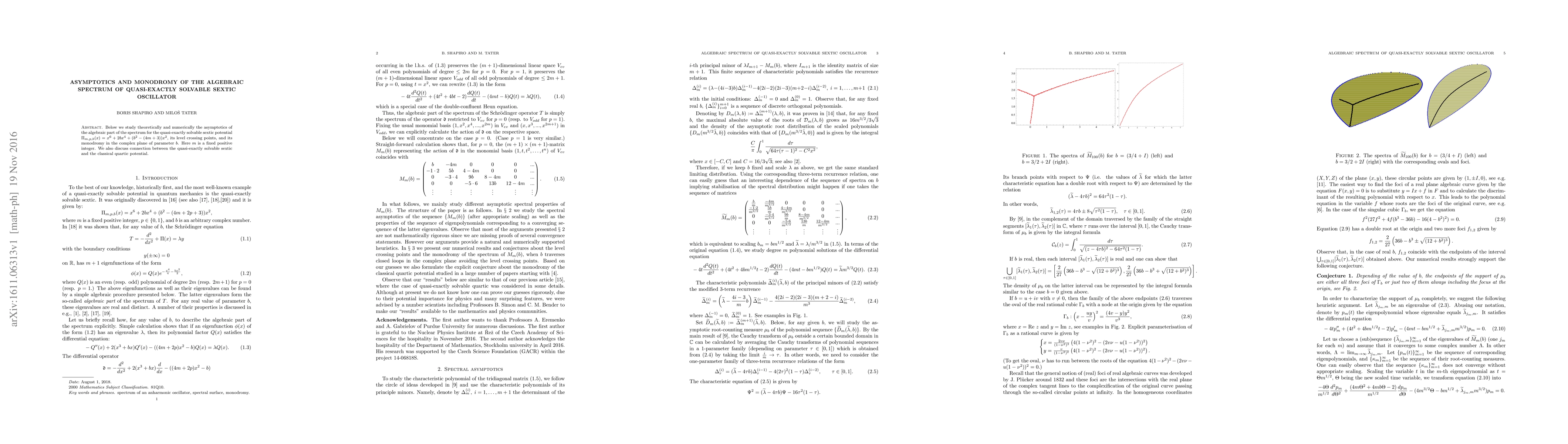 Below we study theoretically and numerically the asymptotics of the algebraic part of the spectrum for the quasi-exactly solvable sextic potential, its level crossing points, and its monodromy in the complex plane of its parameter. We also discuss connection between the quasi-exactly solvable sextic and the classical quartic potential.