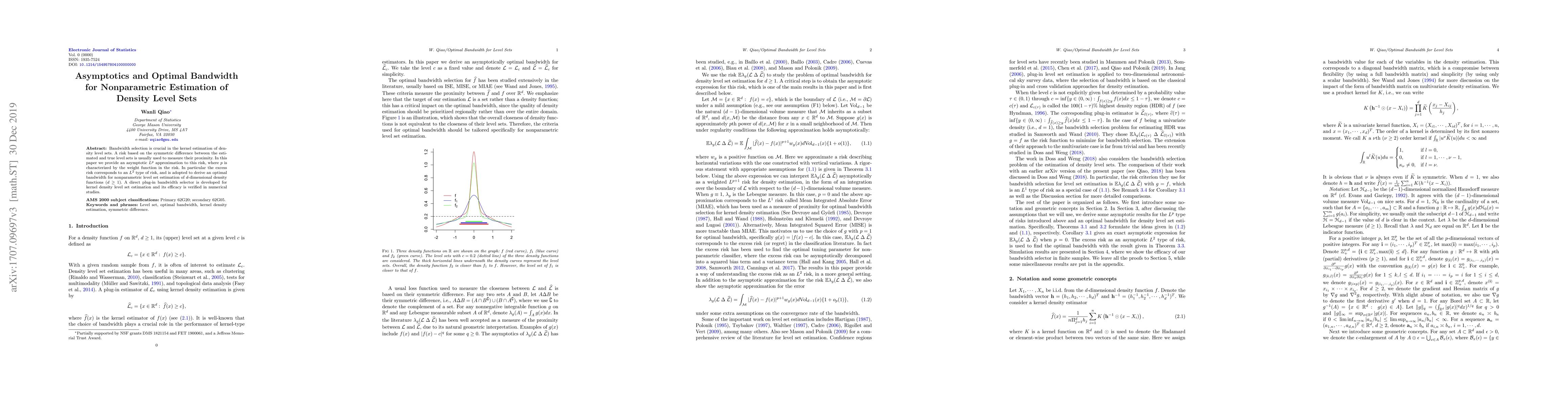 This paper develops an asymptotic $L^p$ approximation for the risk in kernel estimation of density level sets, deriving an optimal bandwidth for $d$-dimensional density functions. A direct plug-in bandwidth selector is proposed and validated through numerical studies.