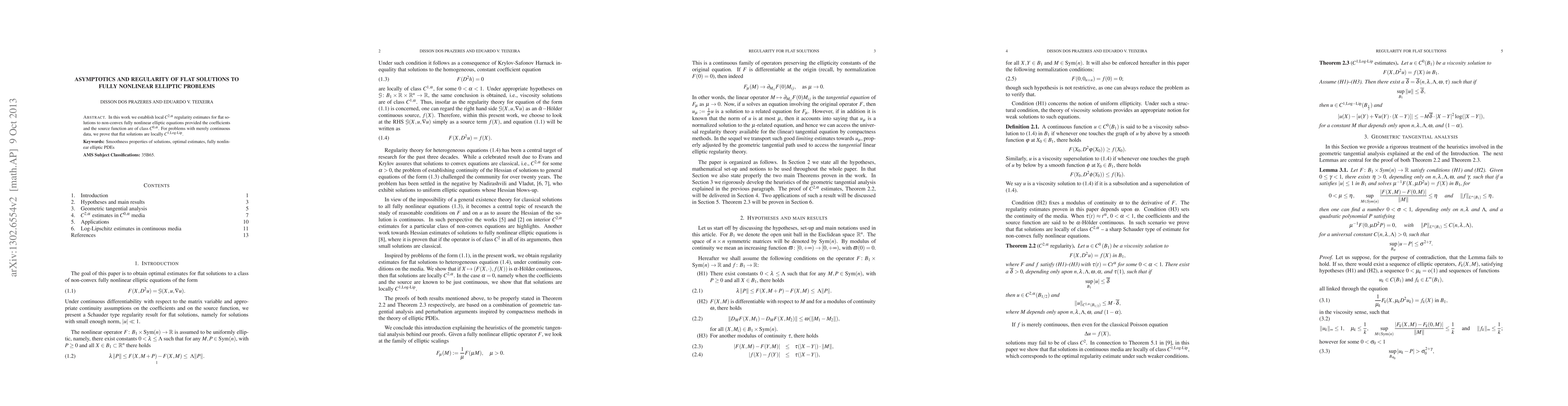 In this work we establish local $C^{2,\alpha}$ regularity estimates for flat solutions to non-convex fully nonlinear elliptic equations provided the coefficients and the source function are of class $C^{0,\alpha}$. For problems with merely continuous data, we prove that flat solutions are locally $C^{1,\text{Log-Lip}}$.