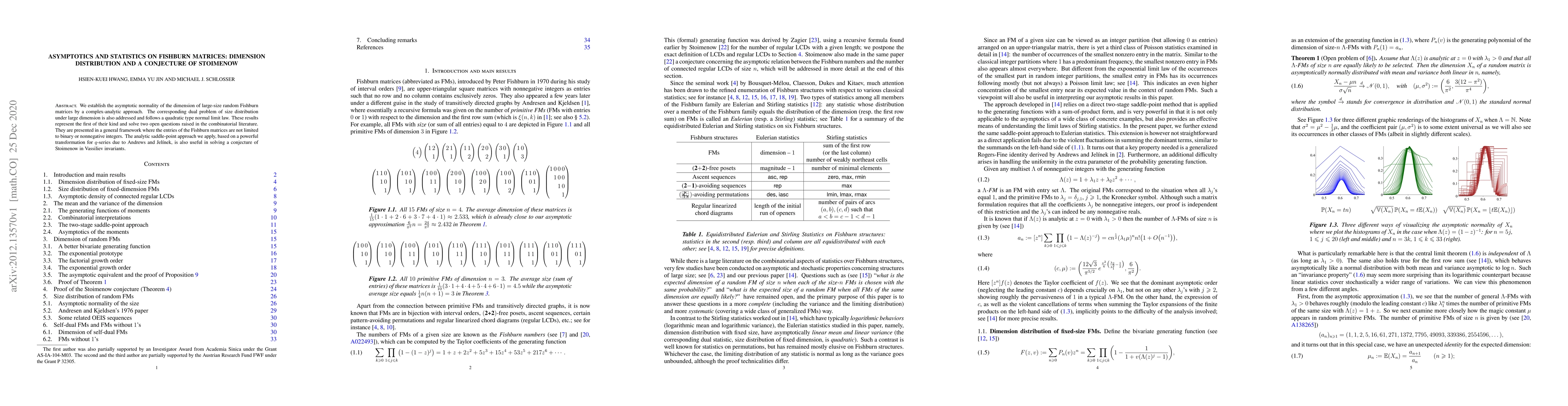 This paper establishes the asymptotic normality of the dimension of large-size random Fishburn matrices using a complex-analytic approach, and addresses the size distribution under large dimension, proving a quadratic normal limit law. It also solves a conjecture of Stoimenow related to Vassiliev invariants.