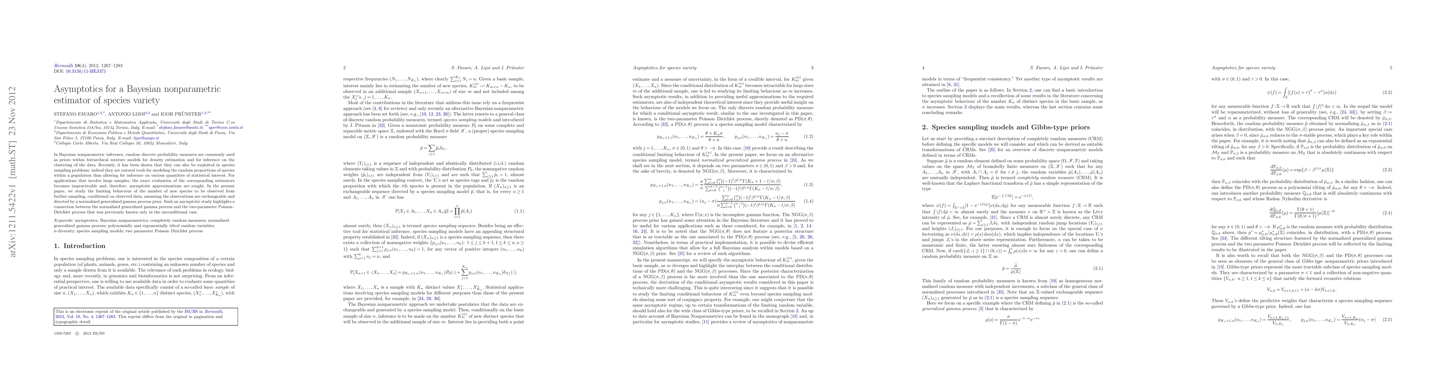 This paper investigates the asymptotic behavior of a Bayesian nonparametric estimator for species variety, focusing on the number of new species expected from further sampling. It establishes a connection between the normalized generalized gamma process prior and the Poisson-Dirichlet process, revealing insights into the conditional inference on species clustering.