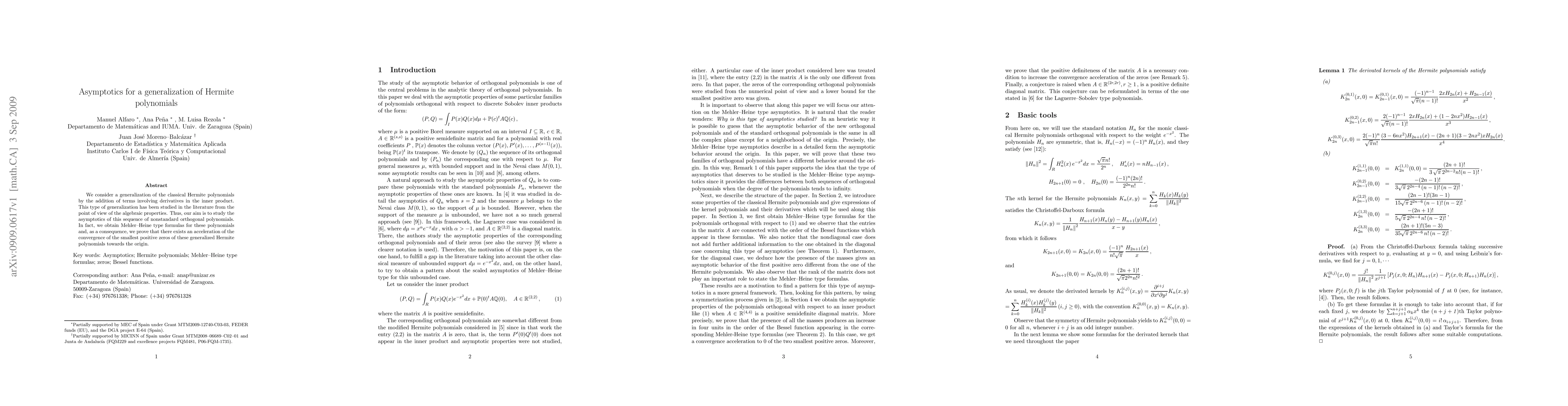 We consider a generalization of the classical Hermite polynomials by the addition of terms involving derivatives in the inner product. This type of generalization has been studied in the literature from the point of view of the algebraic properties. Thus, our aim is to study the asymptotics of this sequence of nonstandard orthogonal polynomials. In fact, we obtain Mehler--Heine type formulas for these polynomials and, as a consequence, we prove that there exists an acceleration of the convergence of the smallest positive zeros of these generalized Hermite polynomials towards the origin.
