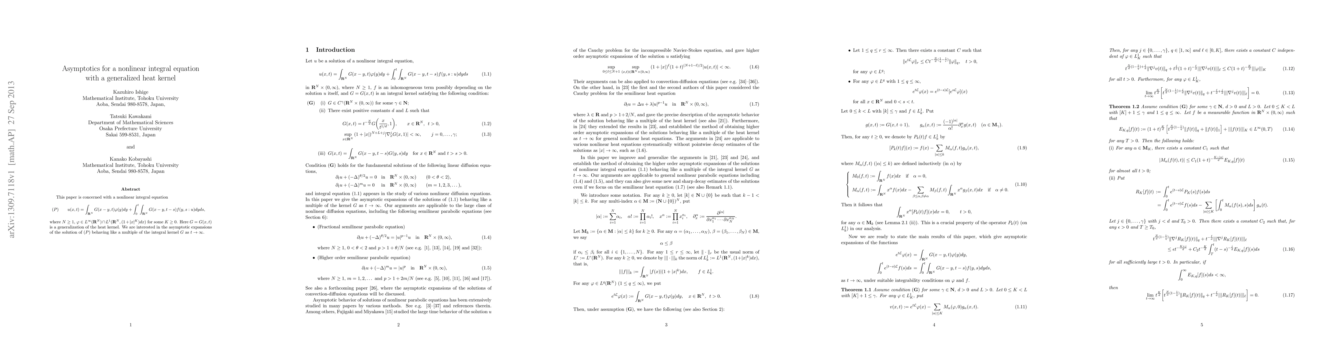 This paper is concerned with a nonlinear integral equation $$ (P)\qquad u(x,t)=\int_{{\bf R}^N}G(x-y,t)\varphi(y)dy+\int_0^t\int_{{\bf R}^N}G(x-y,t-s)f(y,s:u)dyds, \quad $$ where $N\ge 1$, $\varphi\in L^\infty({\bf R}^N)\cap L^1({\bf R}^N,(1+|x|^K)dx)$ for some $K\ge 0$. Here $G=G(x,t)$ is a generalization of the heat kernel. We are interested in the asymptotic expansions of the solution of $(P)$ behaving like a multiple of the integral kernel $G$ as $t\to\infty$.