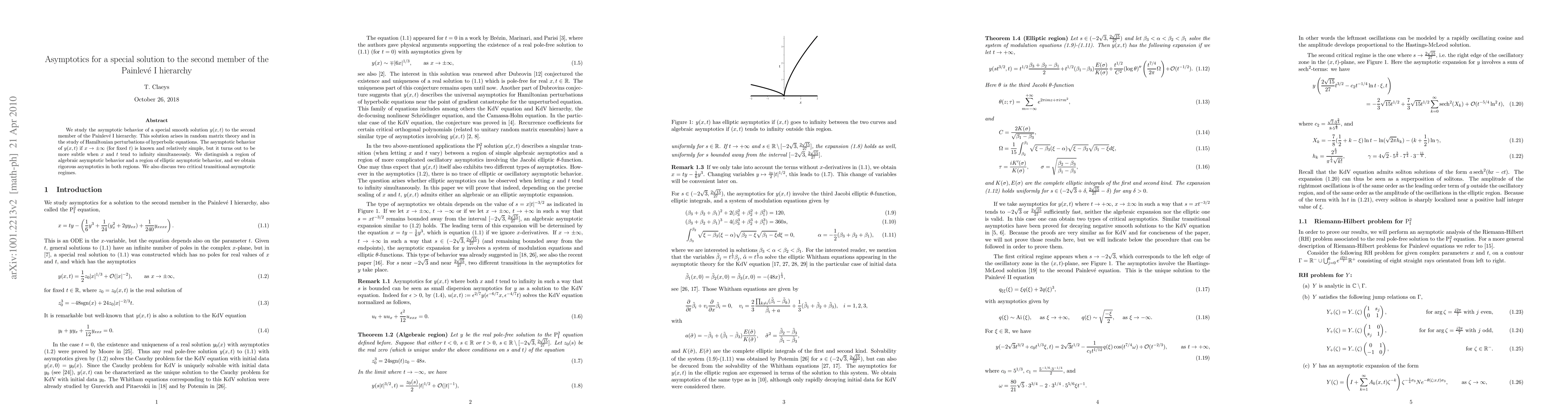 We study the asymptotic behavior of a special smooth solution y(x,t) to the second member of the Painleve I hierarchy. This solution arises in random matrix theory and in the study of Hamiltonian perturbations of hyperbolic equations. The asymptotic behavior of y(x,t) if x\to \pm\infty (for fixed t) is known and relatively simple, but it turns out to be more subtle when x and t tend to infinity simultaneously. We distinguish a region of algebraic asymptotic behavior and a region of elliptic asymptotic behavior, and we obtain rigorous asymptotics in both regions. We also discuss two critical transitional asymptotic regimes.