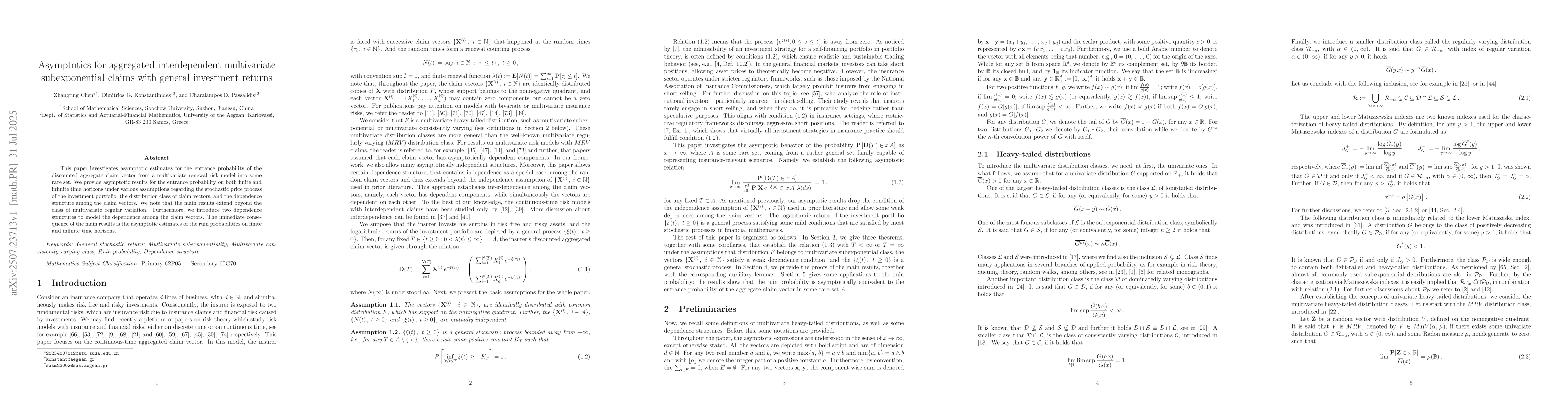 This paper investigates asymptotic estimates for the entrance probability of the discounted aggregate claim vector from a multivariate renewal risk model into some rare set. We provide asymptotic results for the entrance probability on both finite and infinite time horizons under various assumptions regarding the stochastic price process of the investment portfolio, the distribution class of claim vectors, and the dependence structure among the claim vectors. We note that the main results extend beyond the class of multivariate regular variation. Furthermore, we introduce two dependence structures to model the dependence among the claim vectors. The immediate consequence of the main results is the asymptotic estimates of the ruin probabilities on finite and infinite time horizons