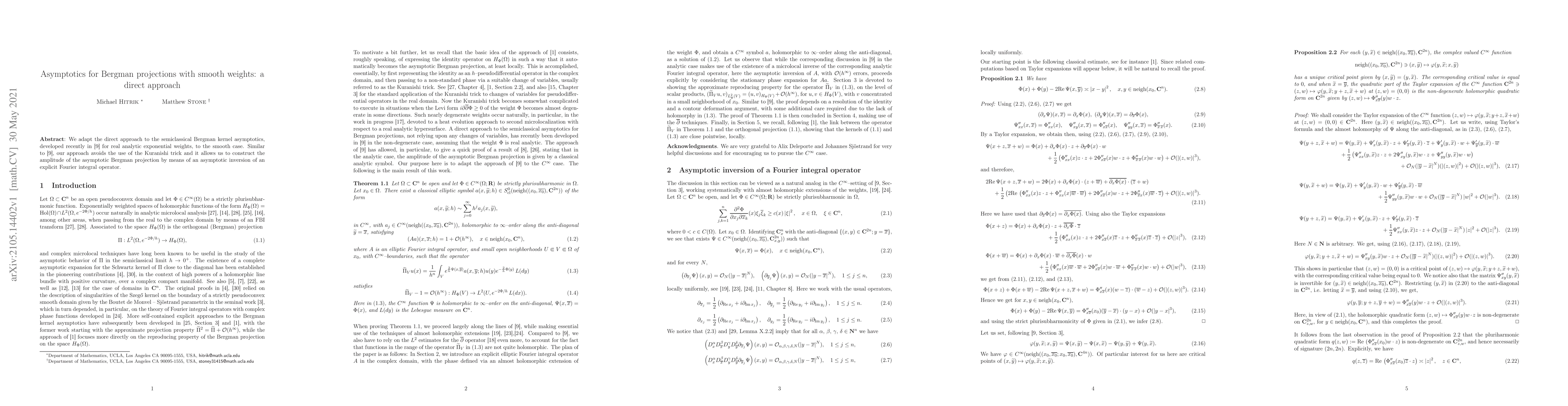 This paper adapts a direct method for semiclassical Bergman kernel asymptotics to smooth weights, avoiding the Kuranishi trick and constructing the asymptotic Bergman projection via an explicit Fourier integral operator inversion. The approach parallels recent work on real analytic exponential weights.
