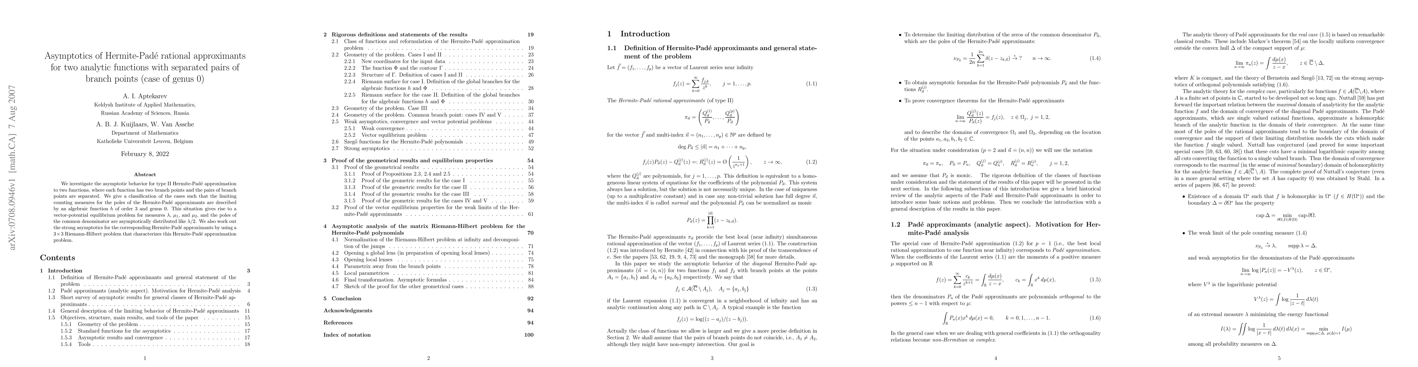 This paper studies the asymptotic behavior of type II Hermite-Pade rational approximants for two analytic functions with separated pairs of branch points. It classifies cases where the limiting measures of the poles are described by an algebraic function of order 3 and genus 0, leading to a vector-potential equilibrium problem, and uses a 3x3 Riemann-Hilbert problem to derive the strong asymptotics.