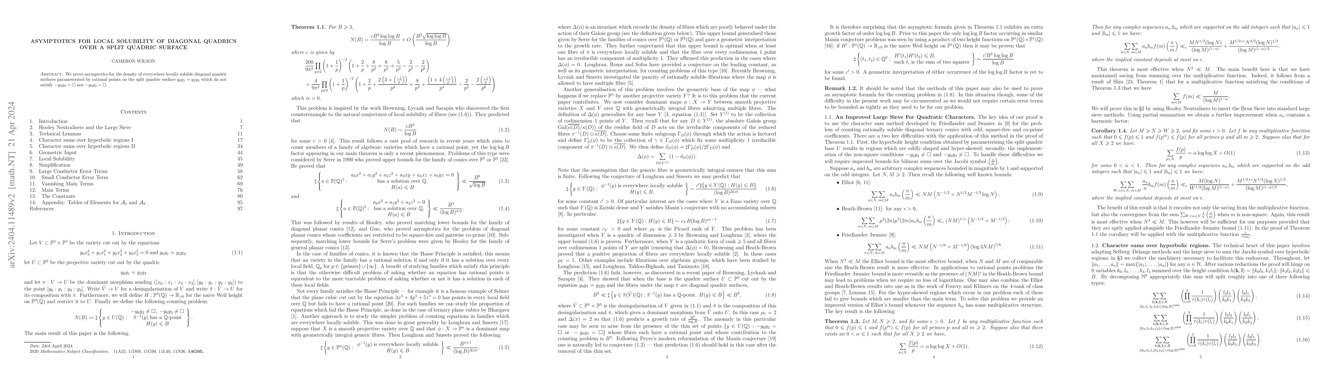 Summary: This paper establishes asymptotic behavior for the density of diagonal quadric surfaces parameterized by rational points on a split quadric surface that remain locally soluble, excluding those satisfying certain conditions. The focus is on the local solubility of these surfaces.
