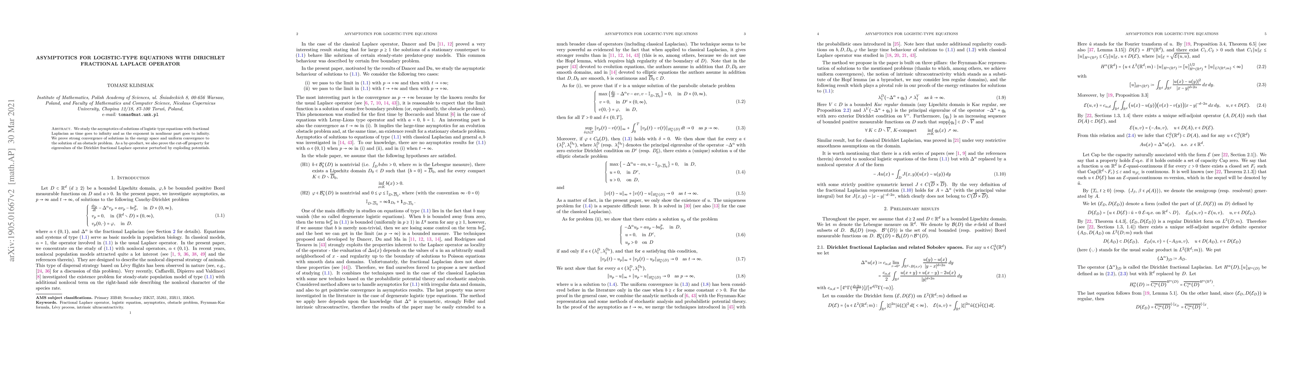 This paper investigates the asymptotic behavior of logistic-type equations involving the fractional Laplacian as time approaches infinity and the nonlinearity exponent increases. It demonstrates strong convergence in the energy space and uniform convergence to an obstacle problem solution.