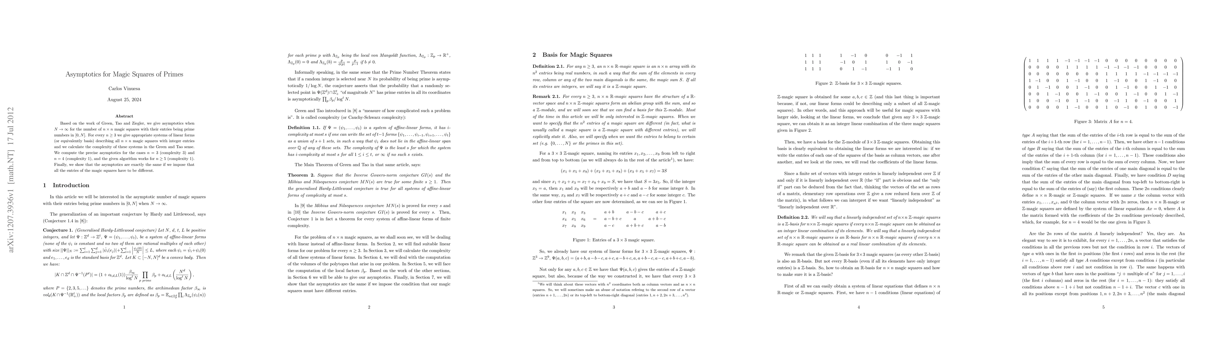 This paper provides asymptotic estimates for the number of $n \times n$ magic squares where all entries are prime numbers within a specified range as $N$ approaches infinity. It computes these estimates for $n=3$ and $n=4$ and outlines a general algorithm for $n \ge 5$.