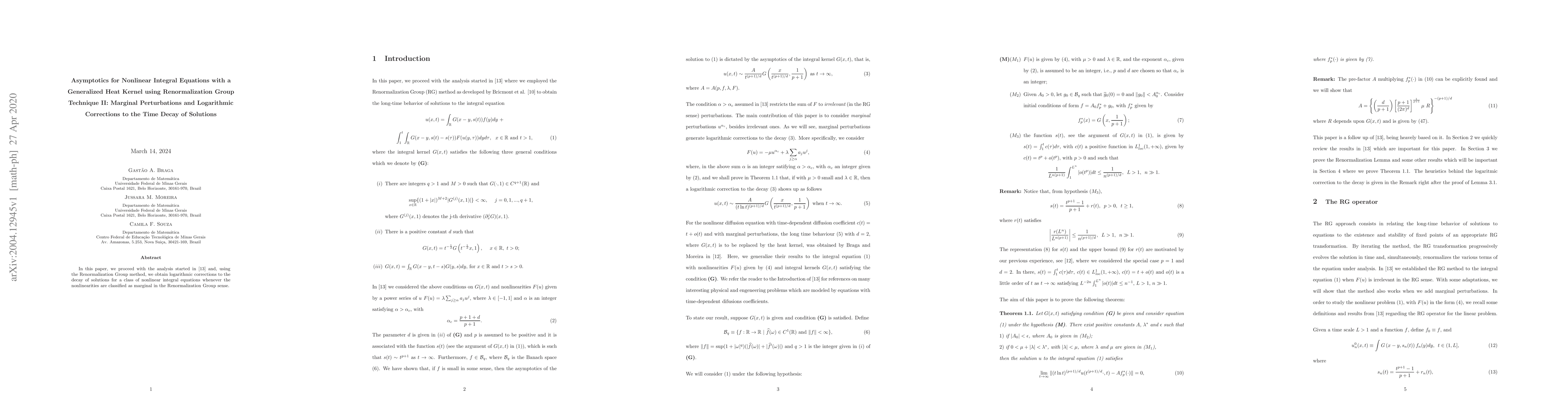 This paper uses a Renormalization Group technique to analyze nonlinear integral equations, finding logarithmic corrections to solution decay rates for marginal nonlinearity cases.