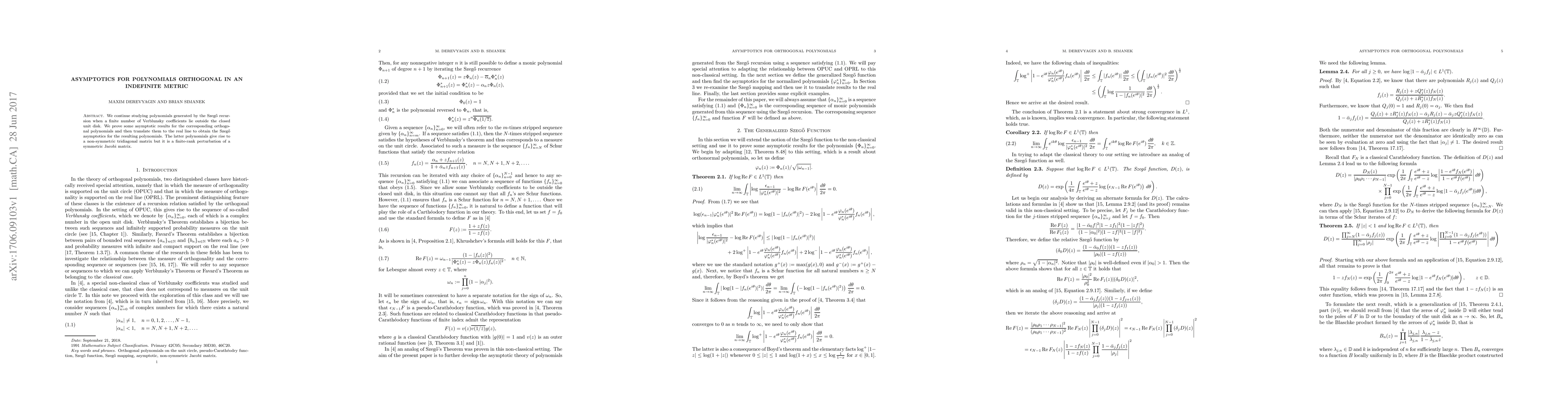 This paper investigates the asymptotic behavior of polynomials orthogonal in an indefinite metric, proving new results for these polynomials and translating them to the real line to derive Szegő asymptotics. The study reveals that the resulting polynomials correspond to a finite-rank perturbation of a symmetric Jacobi matrix.