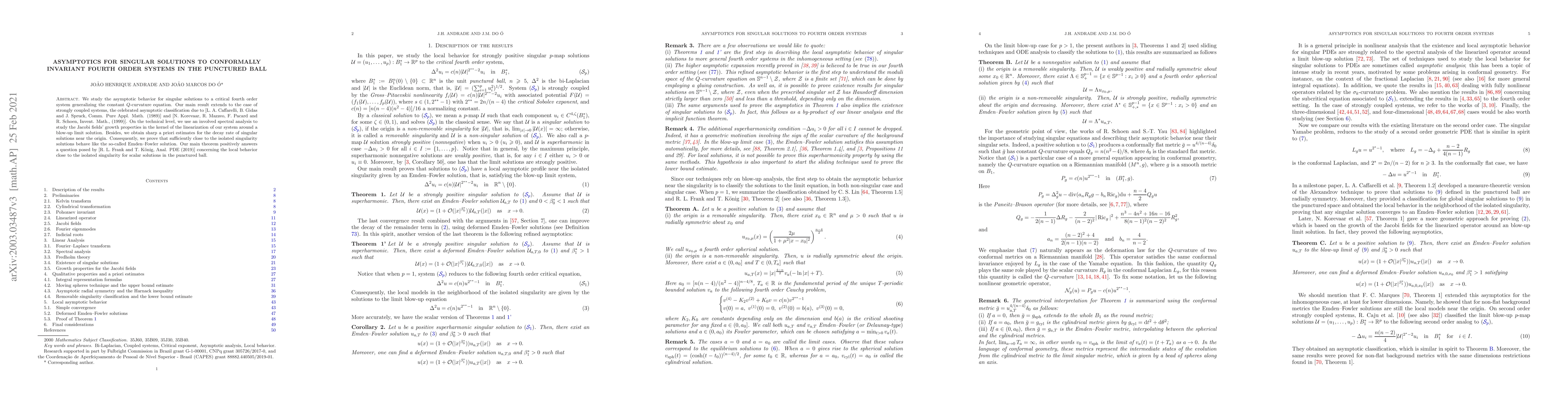 We study the asymptotic behavior for singular solutions to a critical fourth order system generalizing the constant $Q$-curvature equation. Our main result extends to the case of strongly coupled systems, the celebrated asymptotic classification due to [L. A. Caffarelli, B. Gidas and J. Spruck, Comm. Pure Appl. Math. (1989)] and [N. Korevaar, R. Mazzeo, F. Pacard and R. Schoen, Invent. Math., (1999)]. On the technical level, we use an involved spectral analysis to study the Jacobi fields' growth properties in the kernel of the linearization of our system around a blow-up limit solution. Besides, we obtain sharp a priori estimates for the decay rate of singular solutions near the origin. Consequently, we prove that sufficiently close to the isolated singularity solutions behave like the so-called Emden--Fowler solution. Our main theorem positively answers a question posed by [R. L. Frank and T. K\"onig, Anal. PDE (2019)] concerning the local behavior close to the isolated singularity for scalar solutions in the punctured ball.