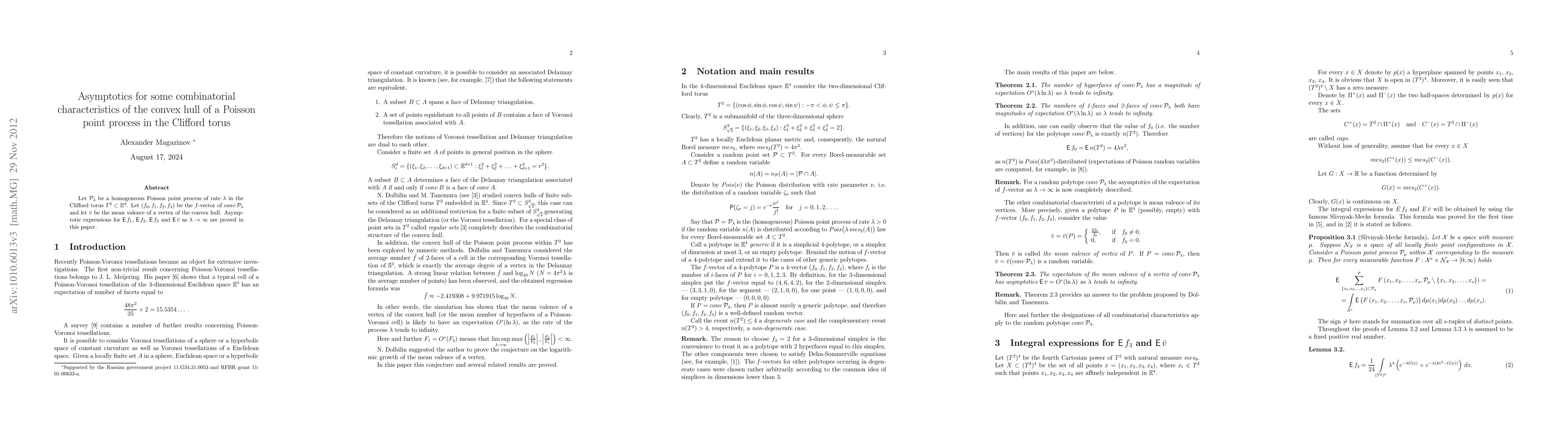 N. Dolbilin and M. Tanemura studied the convex hulls of finite subsets of the Clifford torus $T$ in $E^4$. They have completely studied the combinatorial structure of the convex hull for a periodic point set. Moreover, there was performed a numerical simulation of the convex hull for the Poisson point process on $T$ that showed that the mean valence of a vertex of the convex hull has asymptotics $O^*(\ln \lambda)$ where $\lambda$ is the rate of the process. N. Dolbilin suggested the author to prove the conjecture on the logarithmic growth of the mean degree of a vertex. In this paper we prove this conjecture and some related theorems.