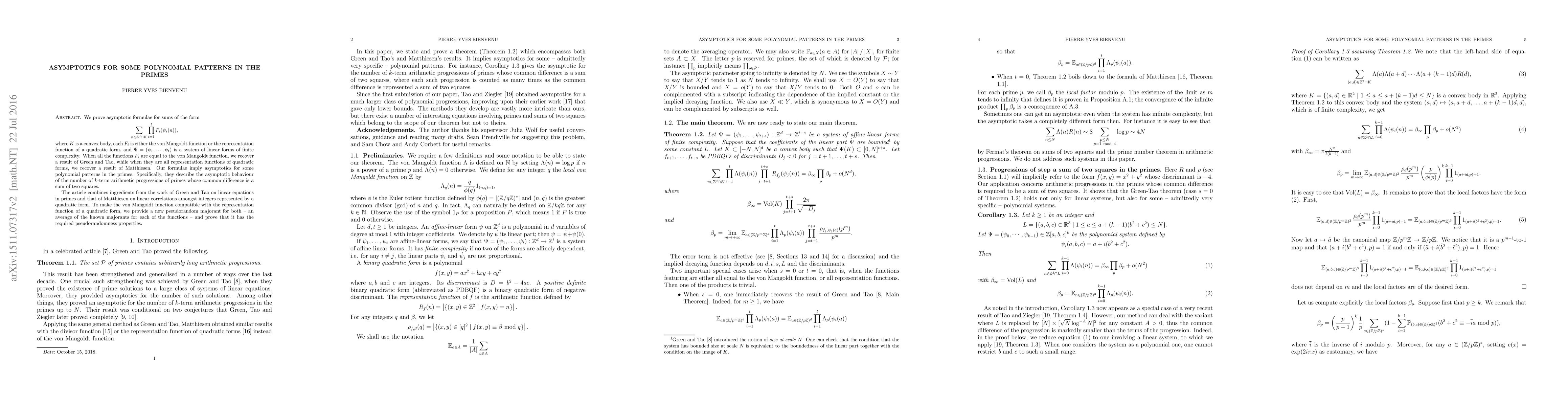 This paper proves asymptotic formulas for sums involving polynomial patterns in primes, recovering results from Green and Tao and Matthiesen, and describes the asymptotic behavior of certain arithmetic progressions of primes.