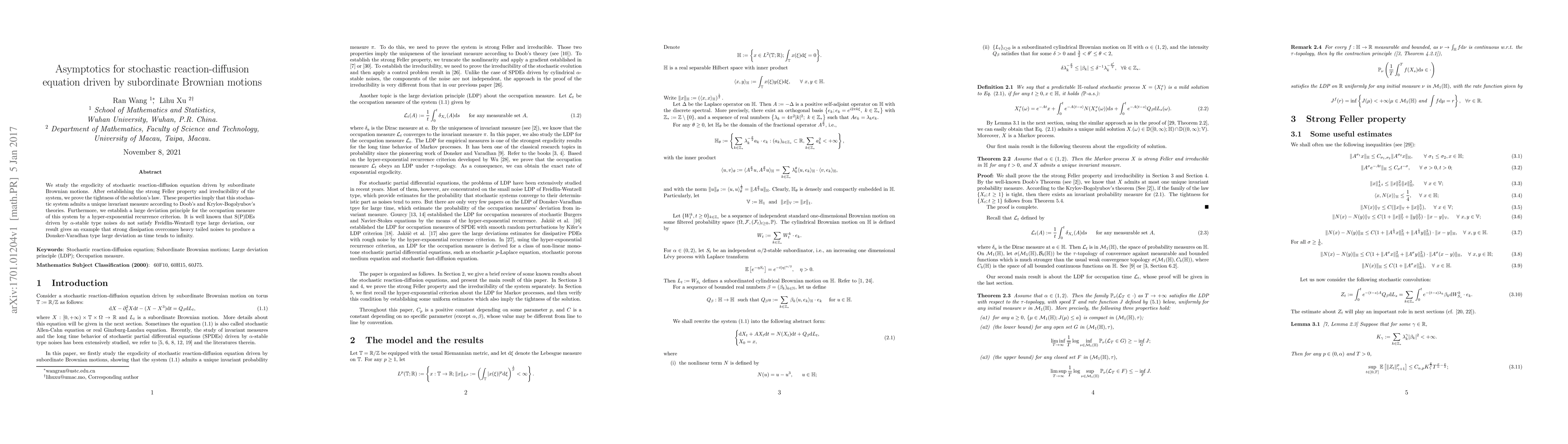 We study the ergodicity of stochastic reaction-diffusion equation driven by subordinate Brownian motions. After establishing the strong Feller property and irreducibility of the system, we prove the tightness of the solution's law. These properties imply that this stochastic system admits a unique invariant measure according to Doob's and Krylov-Bogolyubov's theories. Furthermore, we establish a large deviation principle for the occupation measure of this system by a hyper-exponential recurrence criterion. It is well known that S(P)DEs driven by $\alpha$-stable type noises do not satisfy Freidlin-Wentzell type large deviation, our result gives an example that strong dissipation overcomes heavy tailed noises to produce a Donsker-Varadhan type large deviation as time tends to infinity.
