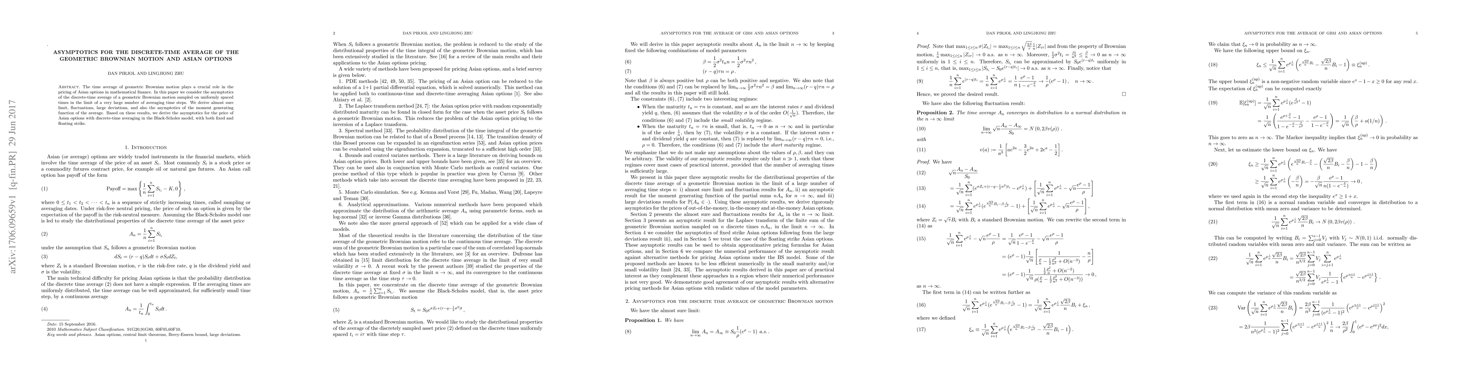 This paper investigates the asymptotic behavior of the discrete-time average of geometric Brownian motion, deriving almost sure limits, fluctuations, and large deviations. It then applies these findings to determine the asymptotic pricing of Asian options in the Black-Scholes model, considering both fixed and floating strike options.