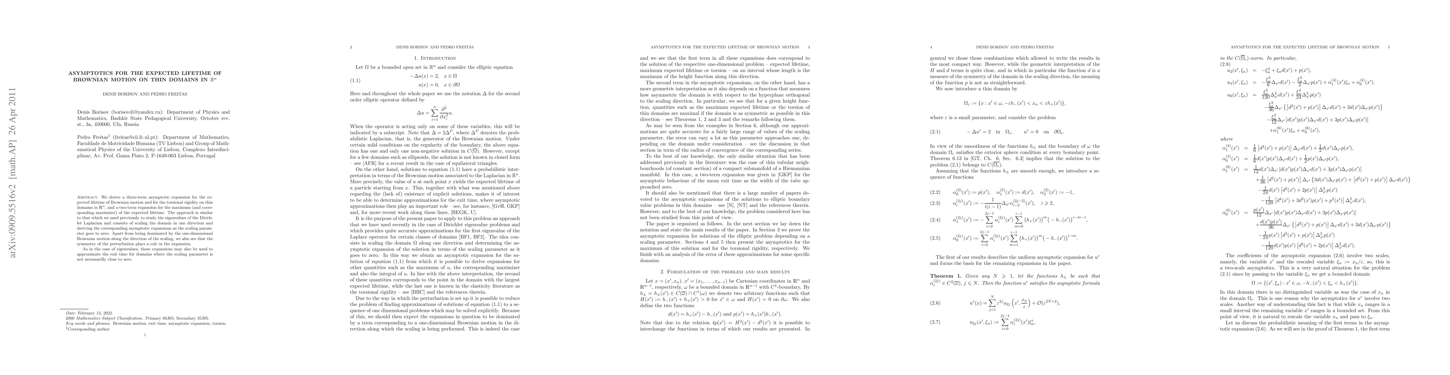We derive a three-term asymptotic expansion for the expected lifetime of Brownian motion and for the torsional rigidity on thin domains in R^n, and a two-term expansion for the maximum (and corresponding maximizer) of the expected lifetime. The approach is similar to that which we used previously to study the eigenvalues of the Dirichlet Laplacian and consists of scaling the domain in one direction and deriving the corresponding asymptotic expansions as the scaling parameter goes to zero. Apart from being dominated by the one-dimensional Brownian motion along the direction of the scaling, we also see that the symmetry of the perturbation plays a role in the expansion. As in the case of eigenvalues, these expansions may also be used to approximate the exit time for domains where the scaling parameter is not necessarilly close to zero.