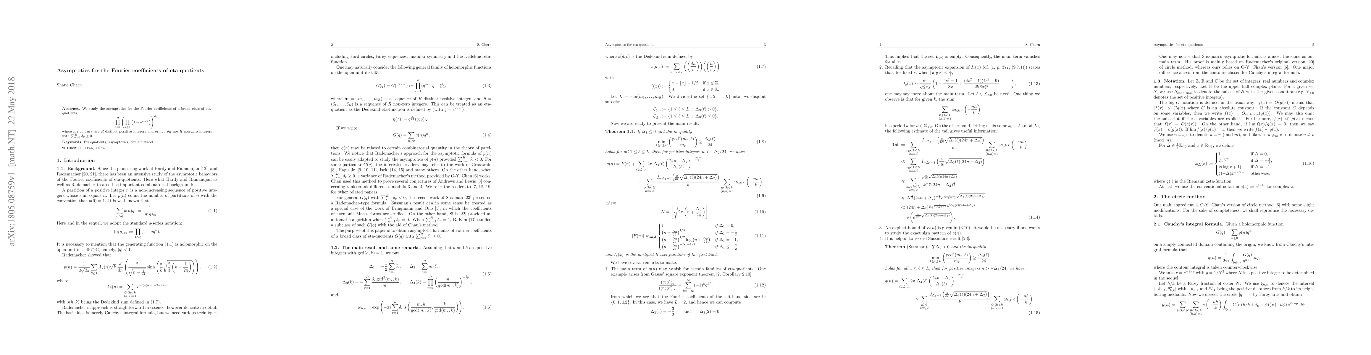 We study the asymptotics for the Fourier coefficients of a broad class of eta-quotients, $$\prod_{r=1}^R \left(\prod_{k\ge 1}\left(1-q^{m_r k}\right)\right)^{\delta_r},$$ where $m_1,\ldots,m_R$ are $R$ distinct positive integers and $\delta_1,\ldots,\delta_R$ are $R$ non-zero integers with $\sum_{r=1}^R \delta_{r}\ge 0$.