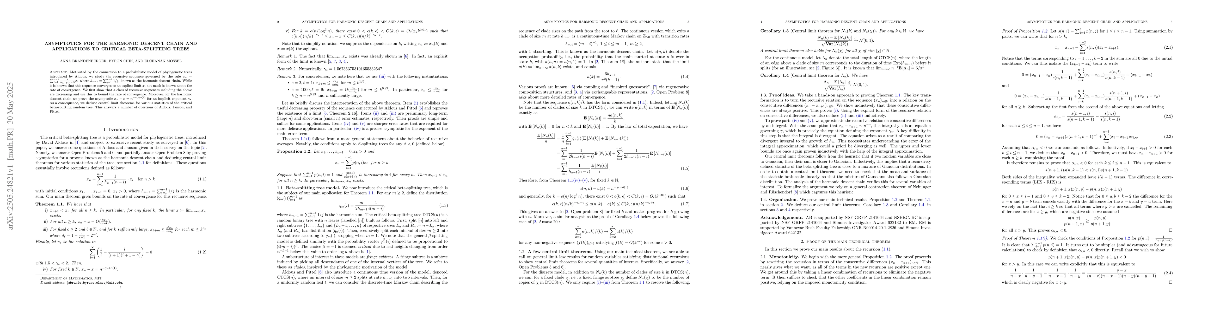 This paper studies the harmonic descent chain, a recursive sequence governing the growth of critical beta-splitting trees, and proves that it converges to an explicit limit with a specific asymptotic rate, leading to central limit theorems for various tree statistics.