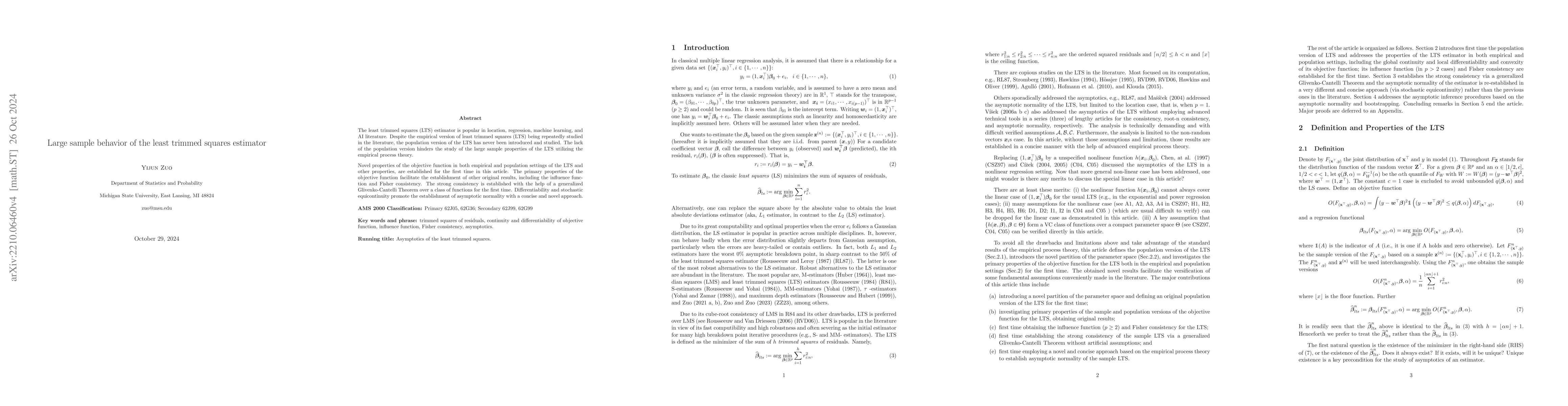 This paper introduces the population version of the least trimmed squares (LTS) estimator and establishes novel properties of its objective function. It demonstrates strong consistency, influence function, Fisher consistency, differentiability, and asymptotic normality, utilizing a generalized Glivenko-Cantelli Theorem and a novel approach.