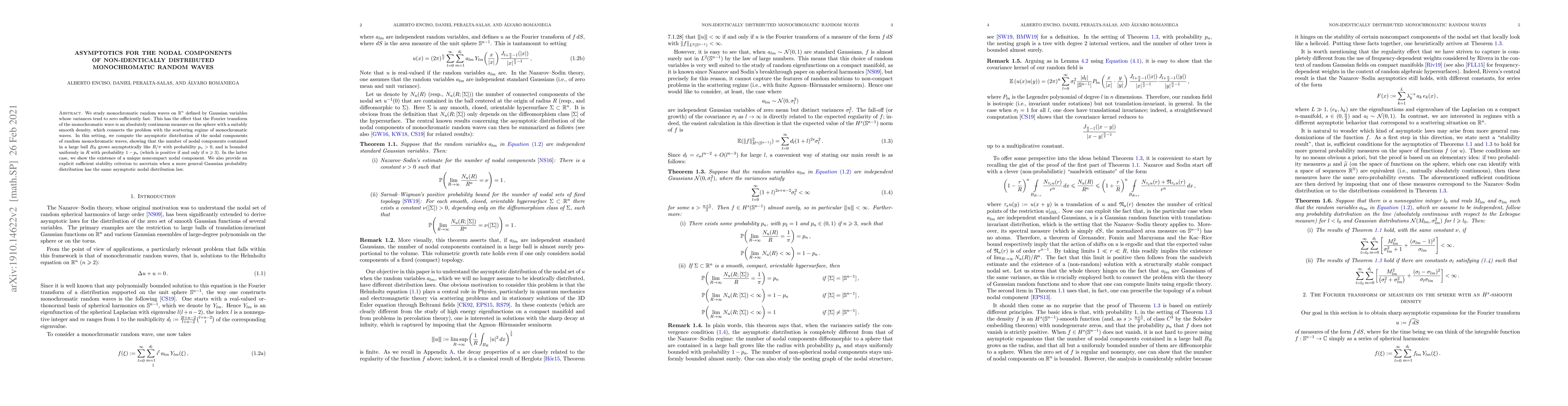 We study monochromatic random waves on $\mathbb{R}^n$ defined by Gaussian variables whose variances tend to zero sufficiently fast. This has the effect that the Fourier transform of the monochromatic wave is an absolutely continuous measure on the sphere with a suitably smooth density, which connects the problem with the scattering regime of monochromatic waves. In this setting, we compute the asymptotic distribution of the nodal components of random monochromatic waves, showing that the number of nodal components contained in a large ball $B_R$ grows asymptotically like $R/\pi$ with probability $p_n>0$, and is bounded uniformly in $R$ with probability $1-p_n$ (which is positive if and only if $n \geq 3$). In the latter case, we show the existence of a unique noncompact nodal component. We also provide an explicit sufficient stability criterion to ascertain when a more general Gaussian probability distribution has the same asymptotic nodal distribution law.