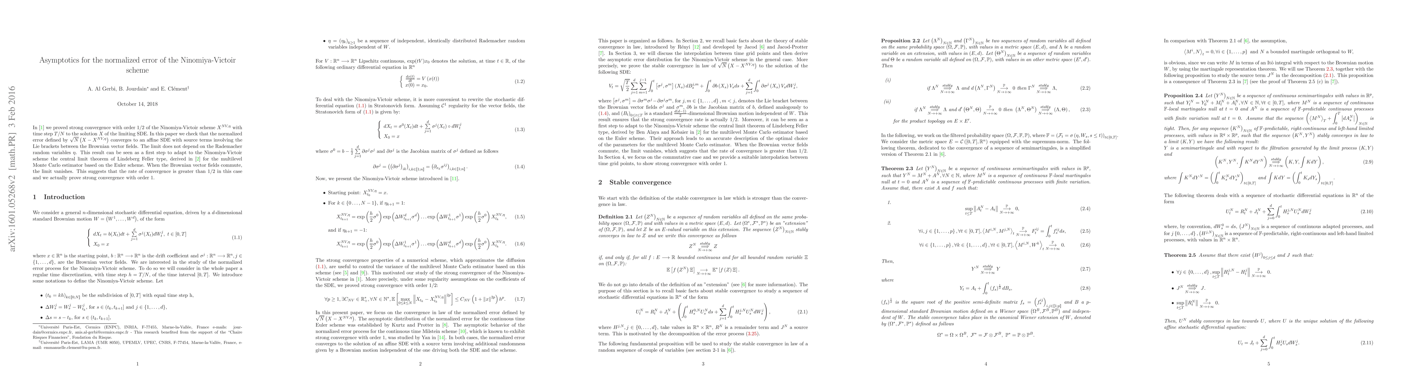 This paper investigates the asymptotic behavior of the normalized error for the Ninomiya-Victoir scheme, showing it converges to an affine SDE. When the Brownian vector fields commute, the limit vanishes, indicating a stronger convergence rate of order 1.