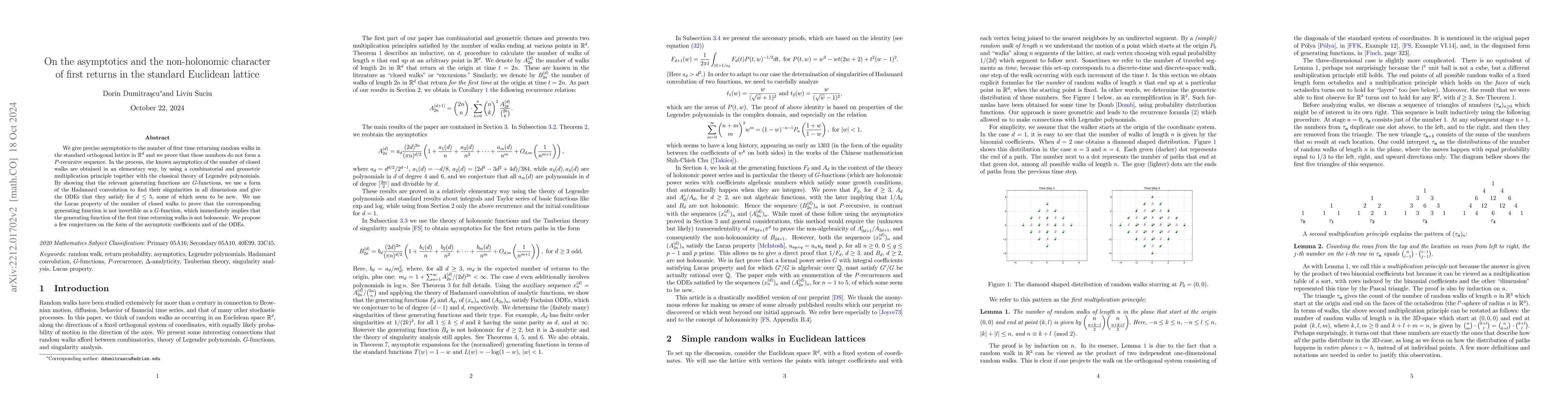 We give precise asymptotics to the number of random walks in the standard orthogonal lattice in $\mathbb{R}^d$ that return to the starting point at step $2n$, both for all such walks and for the ones that return for the first time. The first set of asymptotics is obtained in an elementary way, by using a combinatorial and geometric multiplication principle together with the classical theory of Legendre polynomials. As an easy consequence we obtain a unified proof of P\'{o}lya's theorem. By showing that the relevant generating functions are $\Delta$-analytic, we use the deeper Tauberian theory of singularity analysis to obtain the asymptotics for the first return paths.