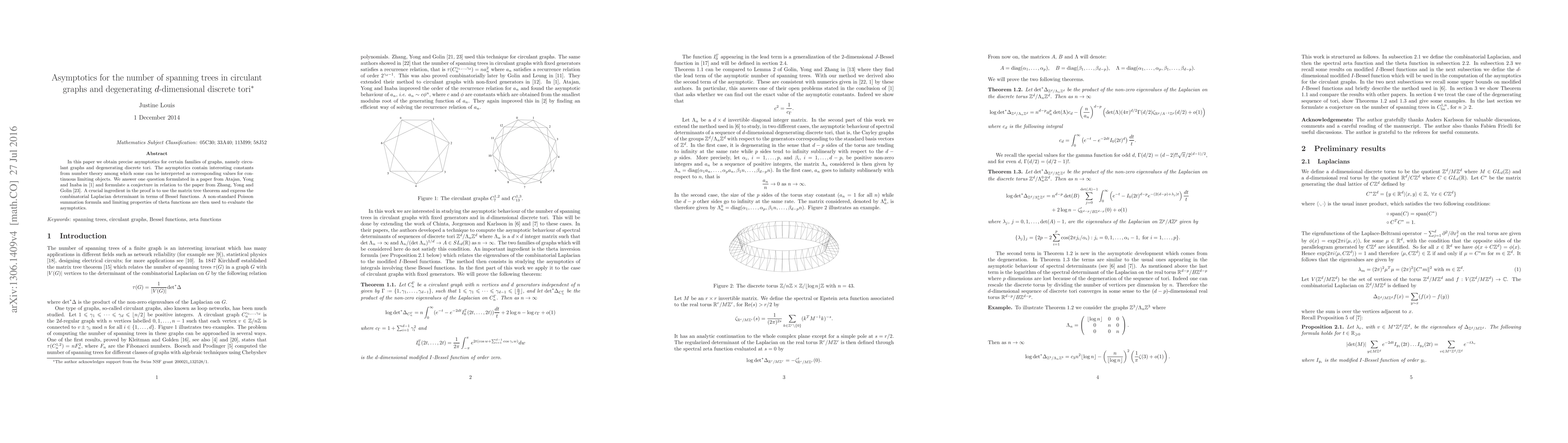 In this paper we obtain precise asymptotics for certain families of graphs, namely circulant graphs and degenerating discrete tori. The asymptotics contain interesting constants from number theory among which some can be interpreted as corresponding values for continuous limiting objects. We answer one question formulated in a paper from Atajan, Yong and Inaba in [1] and formulate a conjecture in relation to the paper from Zhang, Yong and Golin [21]. A crucial ingredient in the proof is to use the matrix tree theorem and express the combinatorial laplacian determinant in terms of Bessel functions. A non-standard Poisson summation formula and limiting properties of theta functions are then used to evaluate the asymptotics.
