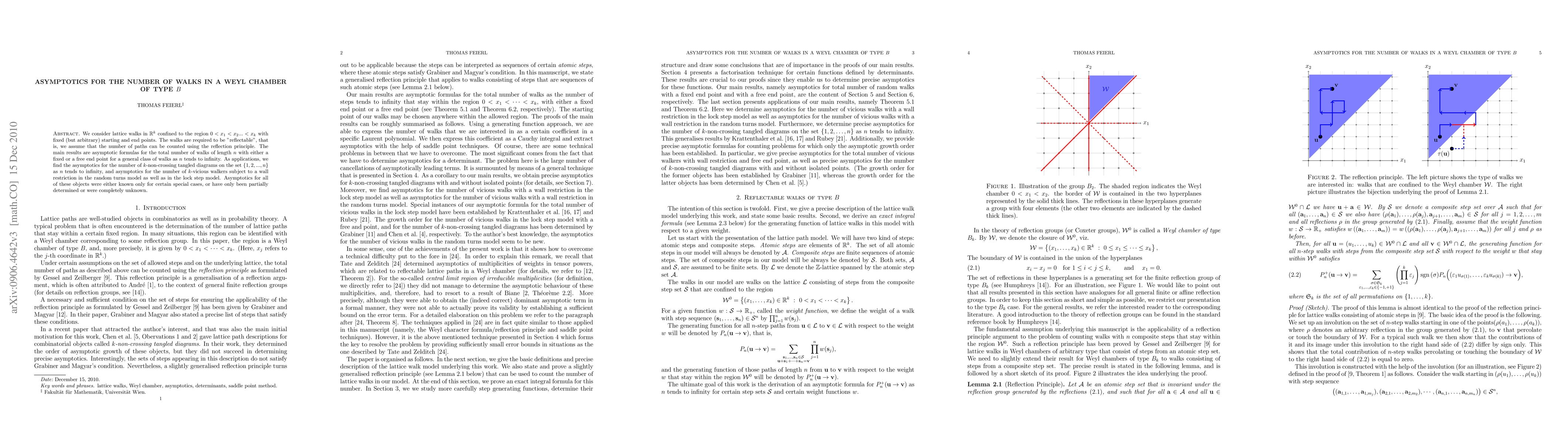 This paper derives asymptotic formulas for the number of reflectable lattice walks in a Weyl chamber of type B, focusing on walks confined to the region with increasing coordinates. It extends these results to $k$-non-crossing tangled diagrams and $k$-vicious walkers, providing new asymptotics where previous results were limited or unknown.