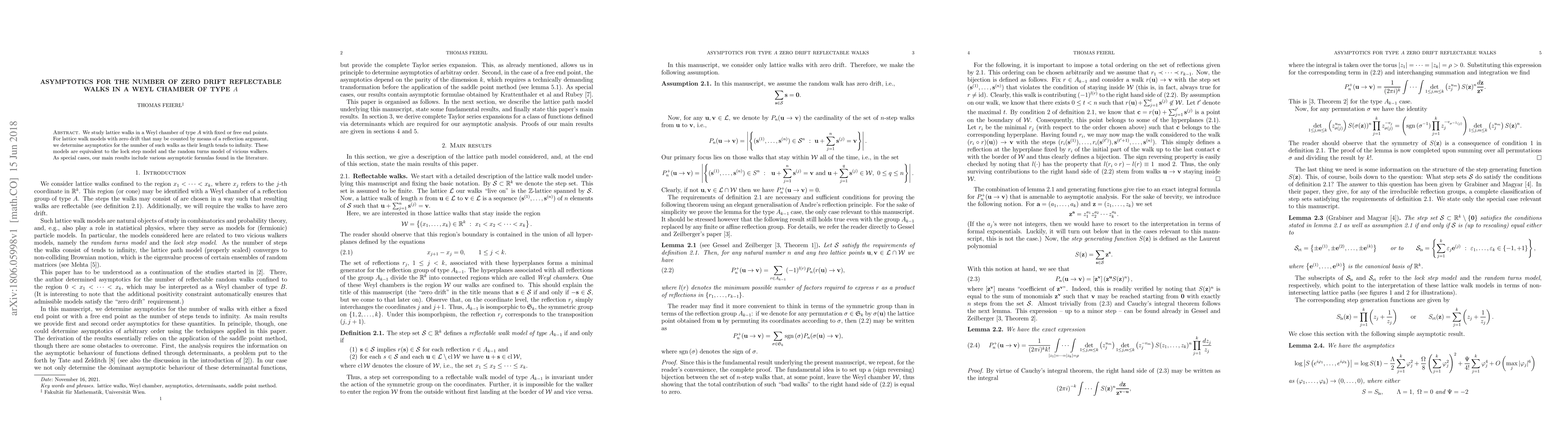 This paper determines asymptotics for the number of zero drift reflectable walks in a Weyl chamber of type A as their length increases, using reflection arguments. The findings are equivalent to results from the lock step and random turns models of vicious walkers.