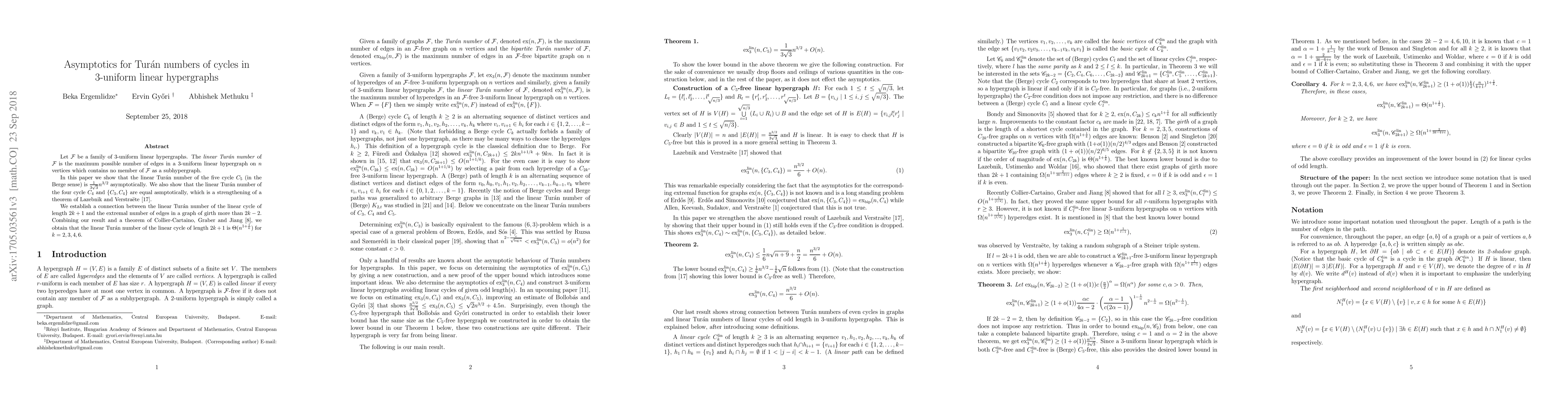 This paper explores the asymptotic behavior of linear Turán numbers for cycles in 3-uniform linear hypergraphs, showing that the linear Turán number for the five-cycle $C_5$ is $\frac{1}{3 \sqrt3}n^{3/2}$ asymptotically. It also establishes the equivalence of the linear Turán numbers for the four-cycle $C_4$ and the set $\{C_3, C_4\}$, and connects these numbers to graph extremal problems.