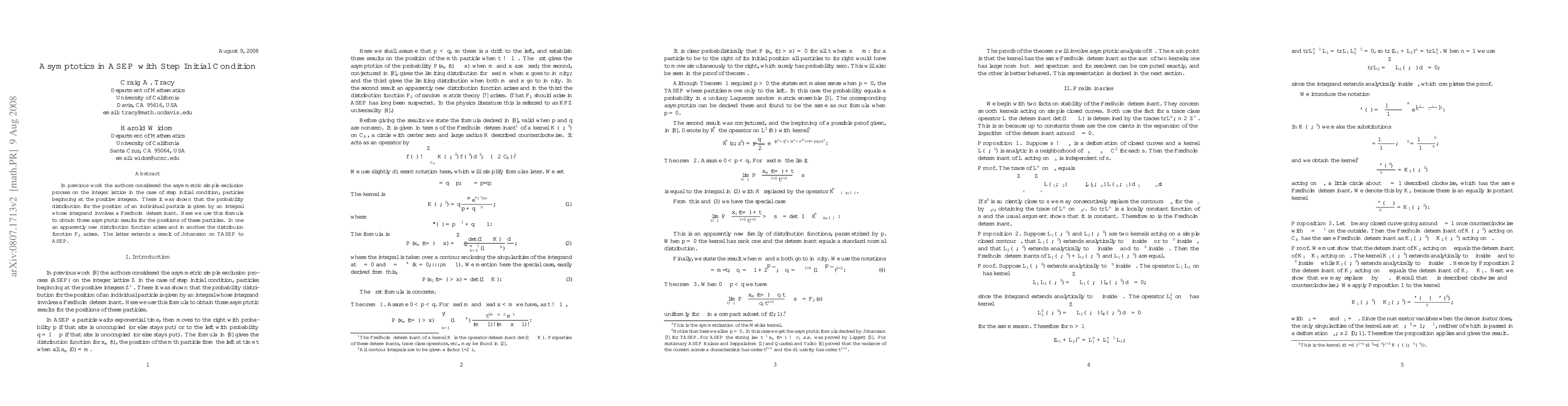 The paper investigates the asymptotic behavior of particles in an asymmetric simple exclusion process on the integer lattice with a step initial condition. It obtains new results on the probability distributions of particle positions and extends existing findings.