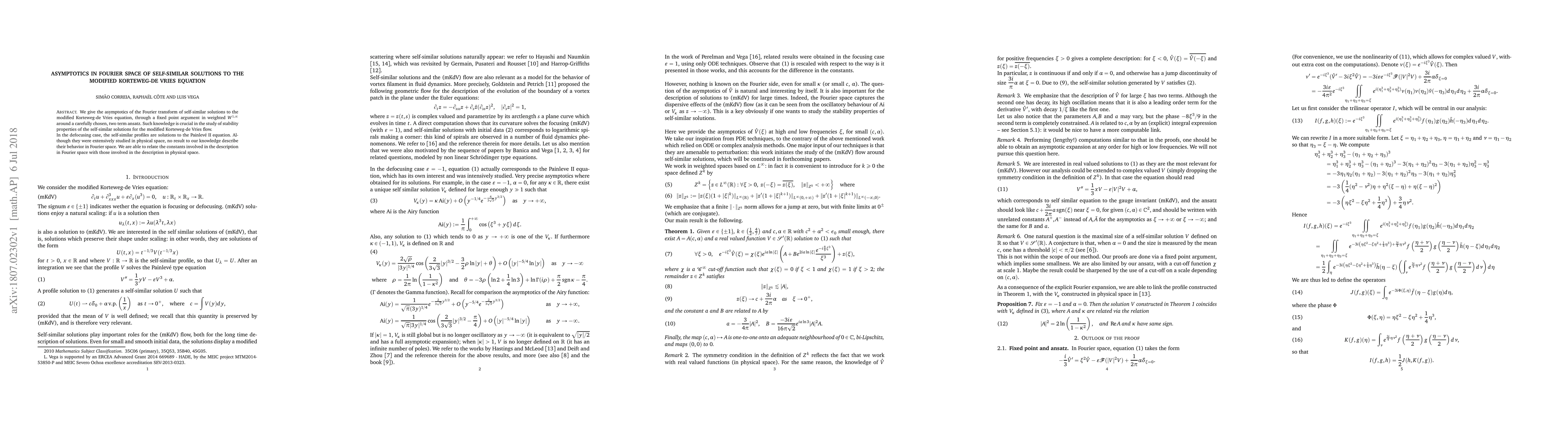 This paper investigates the asymptotic behavior of the Fourier transform of self-similar solutions to the modified Korteweg-de Vries equation using a fixed point argument and a two-term ansatz. It reveals the stability properties of these solutions and relates their Fourier space characteristics with their physical space profiles.