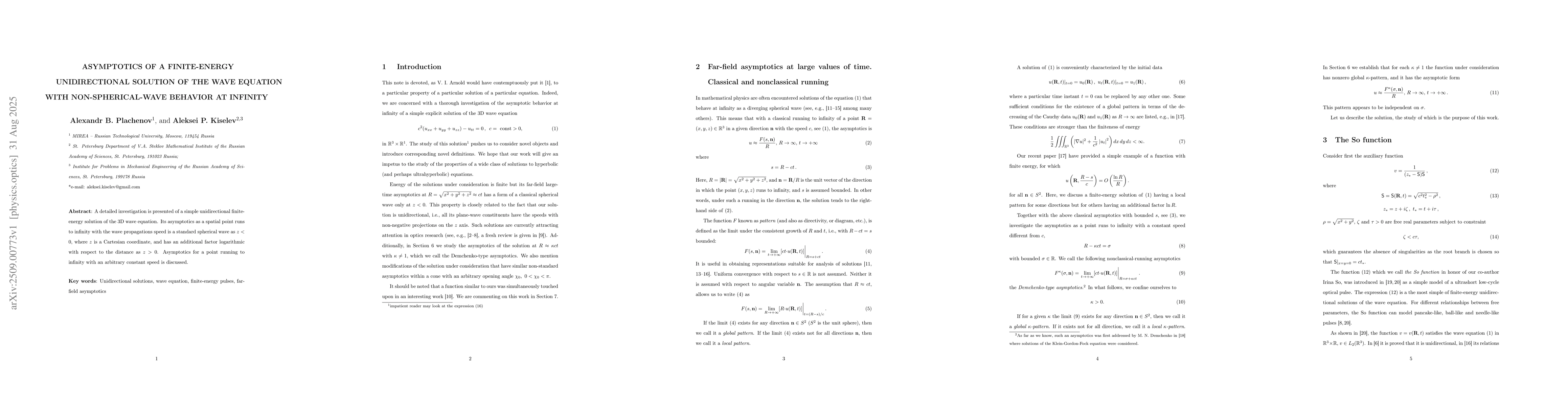 A detailed investigation is presented of a simple unidirectional finite-energy solution of the 3D wave equation. Its asymptotics as a spatial point runs to infinity with the wave propagations speed is a standard spherical wave as z < 0, where z is a Cartesian coordinate, and has an additional factor logarithmic with respect to the distance as z > 0. Asymptotics for a point running to infinity with an arbitrary constant speed is discussed